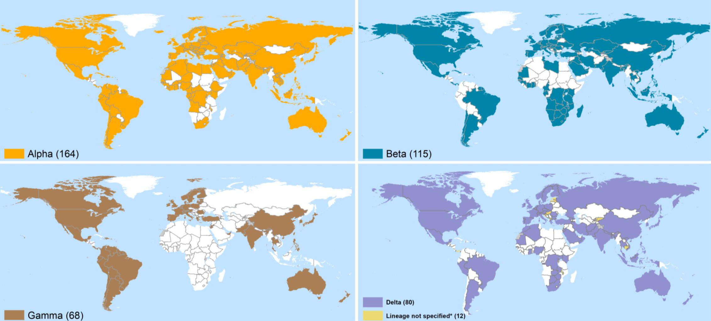 아래의 WHO의 코로나 19 변이 지도에 따르면, 2021년 6월 15일 현재 알파 변이는 전 세계 164개국에서 보고되었으며, 베타 변이는 115개국, 감마 변이는 68개국에서 보고되었으며, 델타 변이는 80개국에서 보고되었다. 한 주 전, 알파 변이는 161개국, 베타 변이는 115개국, 감마 변이는 64개국, 델타 변이는 74개국이었던 것과 비교하면 델타 변이의 확산 속도가 가장 빠르게 증가하고 있음을 알 수 있다. 최근 WHO의 전망에 따르면 델타 변이는 한 두 달 내에 전 세계 코로나 19 우세종이 될 수 있다. 질병관리청에 따르면 한국의 경우 6월 12일 현재 알파 변이 1,663건, 베타 변이 140건, 감마 변이 6건, 델타 변이 155건이 발생했다. 델타 변이는 한국에서 5월 15일 처음 보고된 이후 급속히 증가해 현재 알파 변이 다음으로 많은 사례가 발생했다.