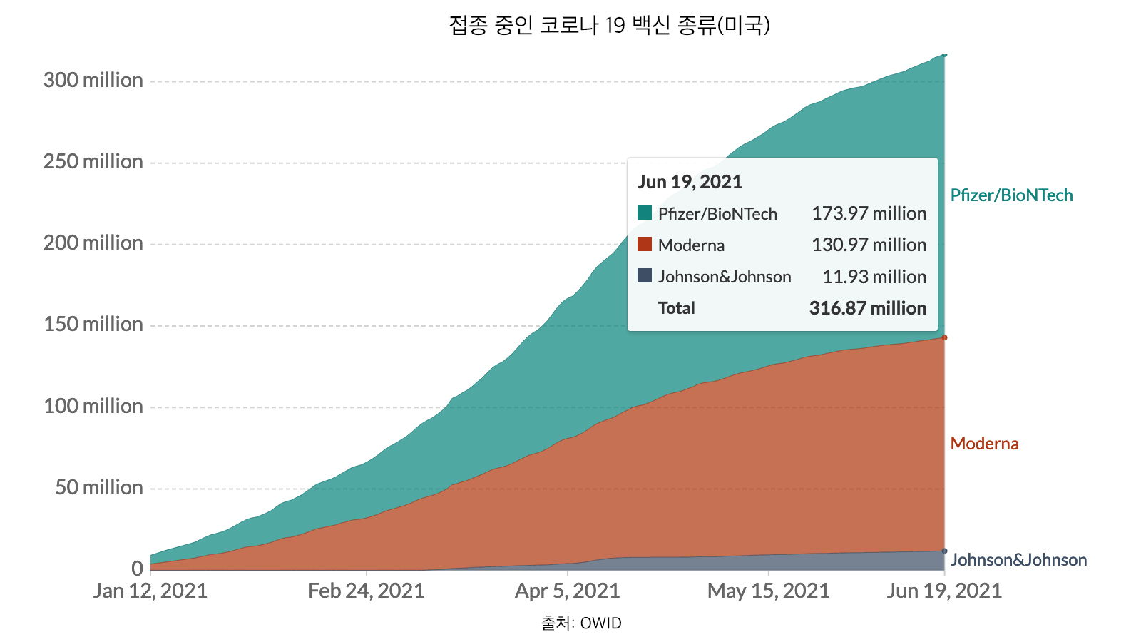 미국은 6월 19일 현재 총 3억1,687만 회의 백신 중 화이자-바이오엔테크가 1억7,397만 회, 모더나가 1억3,097회, 존슨앤드존슨(얀센)이 1,193만 회가 투여되었다.