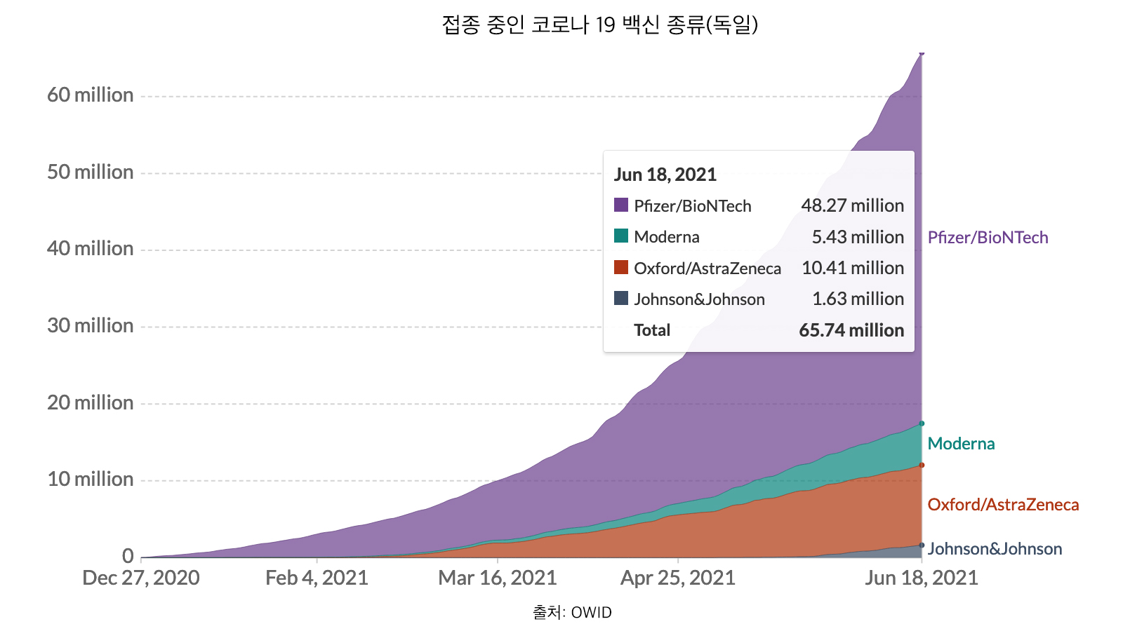 독일은 6월 18일 현재 총 6,674만 회의 백신 중 화이자-바이오엔테크 백신이 4,827만 회, 옥스퍼드-아스트라제네카가 1,041만 회, 모더나가 543만 회, 존슨앤드존슨(얀센)이 163만 회 투여되었다.