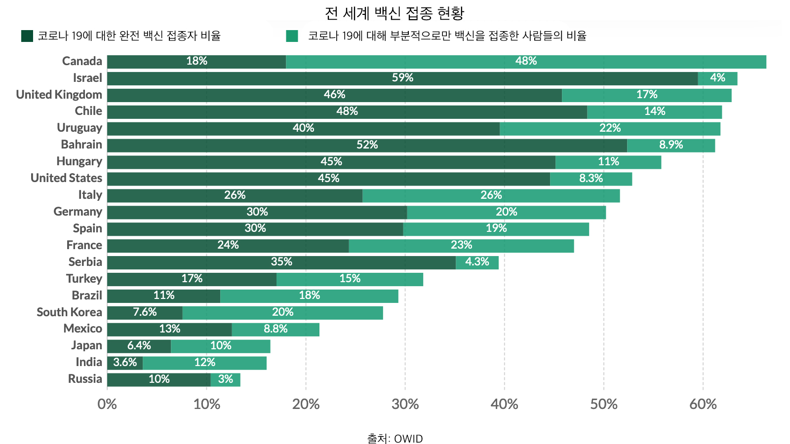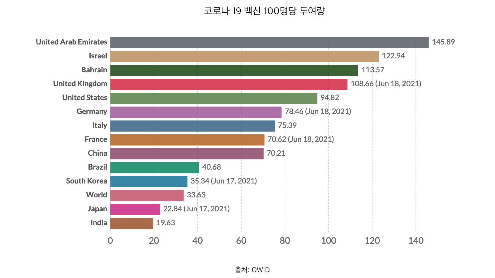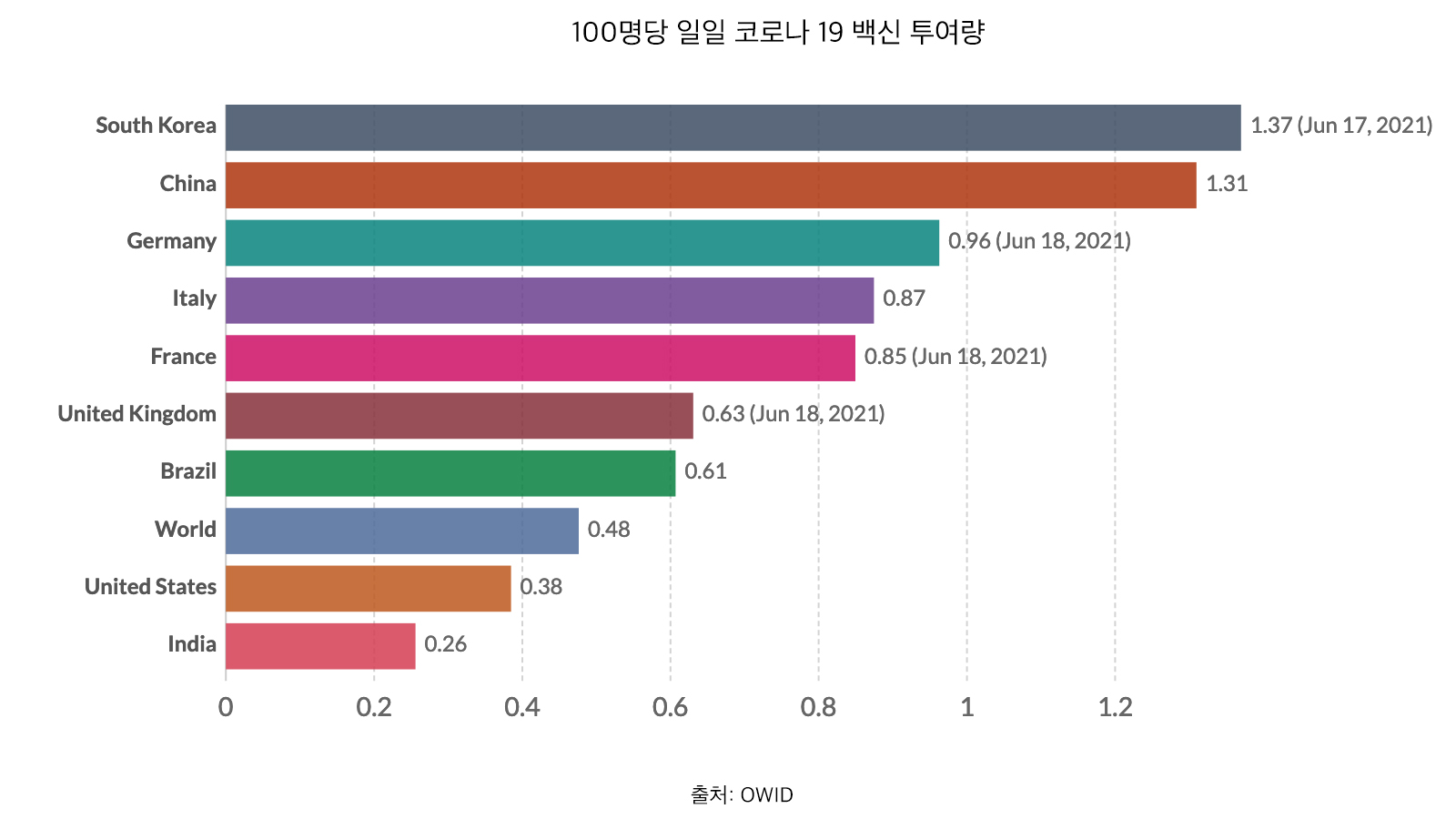1백 명당 1일 접종량을 보면, 전 세계 평균은 1일 1백 명당 0.48명이 백신을 접종받고 있다. 한국은 6월 17일 현재 1백 명당 1.37명이 백신을 접종받고 있으며, 전 세계에서 가장 빠르게 백신 주사가 투여되고 있는 나라다.