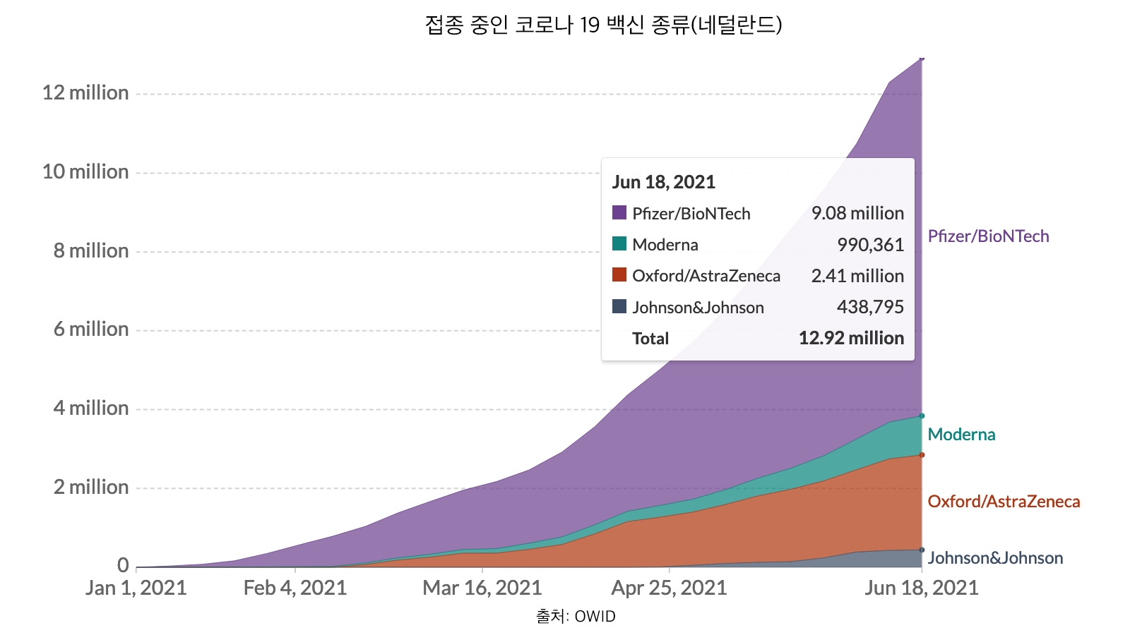 네덜란드는 6월 18일 현재 1,292만 회의 백신 투여 중 화이자-바이오엔테크가 908만 회, 옥스퍼드-아스트라제네카가 241만 회, 모더나가 99만 회, 존슨앤드존슨(얀센)이 43만 회가 투여되었다.