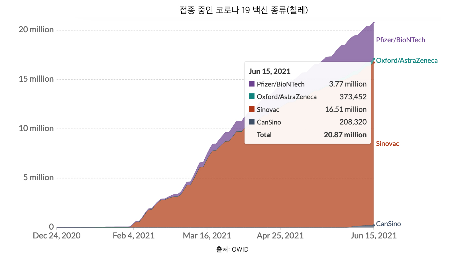 칠레는 6월 15일 현재 2,087만 회의 백신 중 시노백 백신이 1,651만 회, 화이자-바이오엔태크가 377만 회, 옥스퍼드-아스트라제네카가 37만 회, 캔시노가 20만 회 투여되었다.