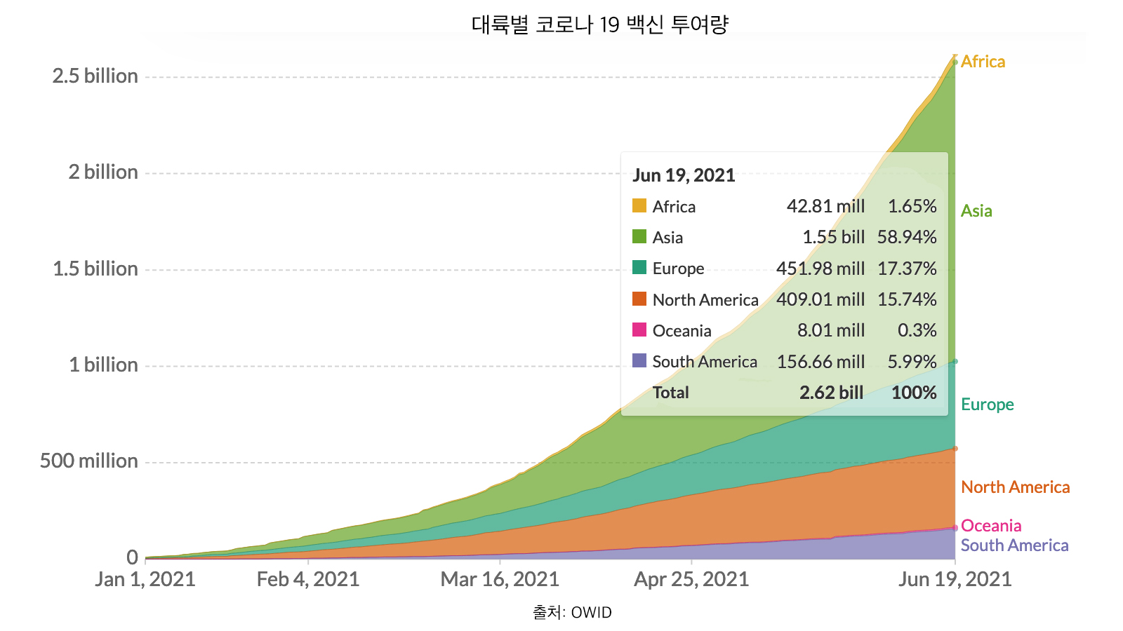 대륙별로 백신 투여량은 큰 차이를 보인다. 아시아 대륙은 지금까지 15억5천만 회의 백신이 투여되어 전체의 58.94%를 차지하고 있지만, 오세아니아는 800만 회로 0.3%, 아프리카는 4,281만 회로 1.65%, 남아프리카는 1억5,666만 회로 5.99%를 차지하고 있다. 이 비율은 대륙별 인구 차이로 인해 백신의 실질적인 공급 현황을 제대로 반영하지 못한다.