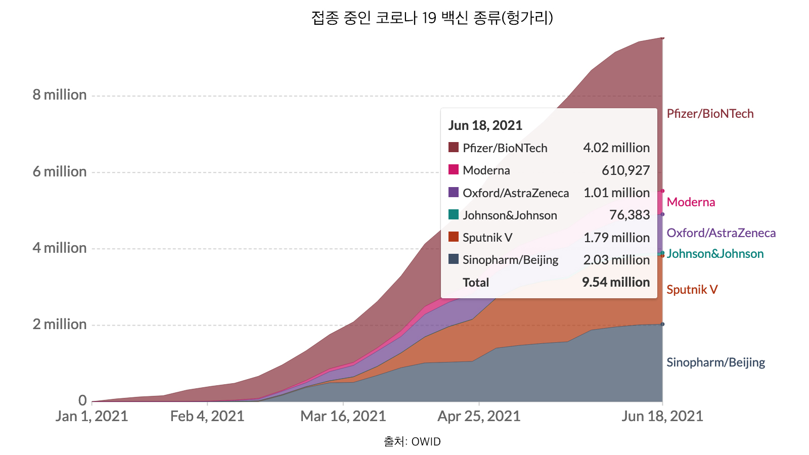 헝가리는 6월 18일 현재 954만 회의 백신이 투여됐고, 그중 화이자-바이오엔테크가 402만 회, 시노팜이 203만 회, 스푸트니크V가 179만 회, 옥스퍼드-아스트라제네카가 101만 회, 모더나가 61만 회 투여되었다.