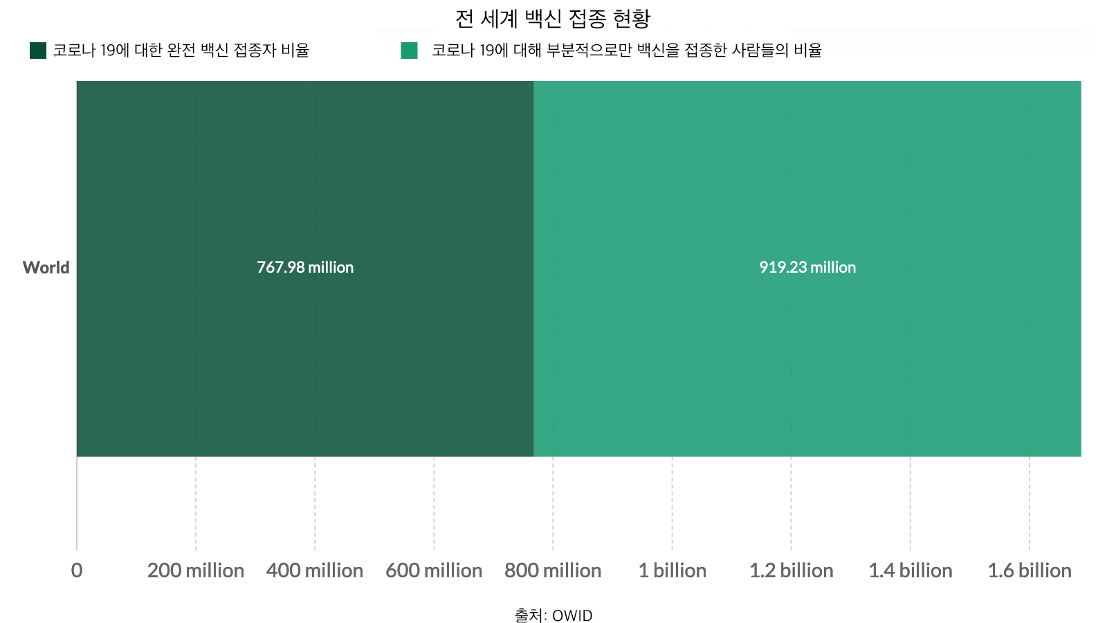 Our World in Data(OWID) 백신 통계에 따르면 6월 19일 현재 세계 인구의 21.5%, 16억8천만 명이 적어도 1회 이상의 코로나 19 백신을 투여받았다. 이 가운데 백신 접종이 완료된 인구는 7억6천만 명이다.