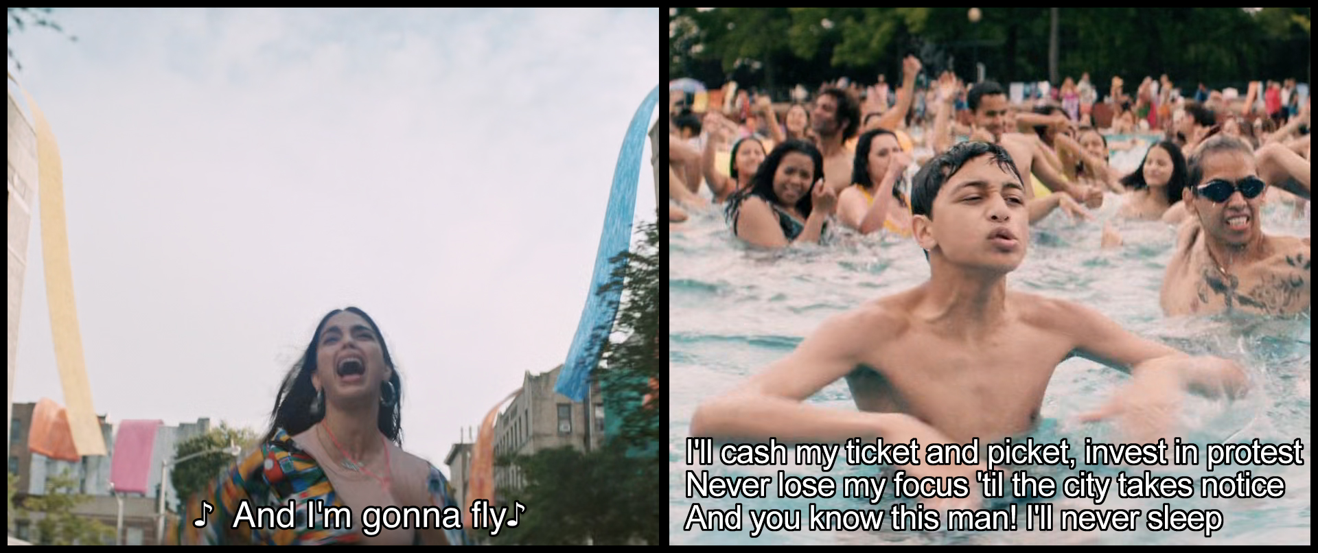 미란다 본인이 거주하는 워싱턴 하이츠가 직면한 젠트리피케이션을 빼고 대신 삽입된 소위 불법체류자 쏘니의 투쟁은 트럼프와 흑인 생명도 소중하다는 BLM운동의 유행에 편승한 아주 상업적 트릭이었다. 문제는 쏘니와 공동체가 자신들의 힘으로 그 문제를 해결하는 것이 아니라 아부엘라의 행운, 외부에서 떨어진 복권이 문제의 해결사로 등장하는 것이다. '96,000'은 《인 더 하이츠》에서 '인 더 하이츠' 못지않은, 아니 그 이상의 뛰어난 뮤지컬 넘버임에도 불구하고, 워싱턴 하이츠가 자신의 문제를 해결할 수 없으며 환상의 복권 당첨금에 기대고 있음을 보여준다. 더구나 영화에서 이 넘버는 뮤지컬과 달리 워싱턴 하이츠 거리와 잡화점 앞에서 벌어지지 않고, 화려한 안무를 위해 수영장으로 장소를 옮기면서 서민들의 즐거운 상상에서 현실과 동떨어진 화려한 물욕의 냄새를 풍기는 환상이 되고 말았다.