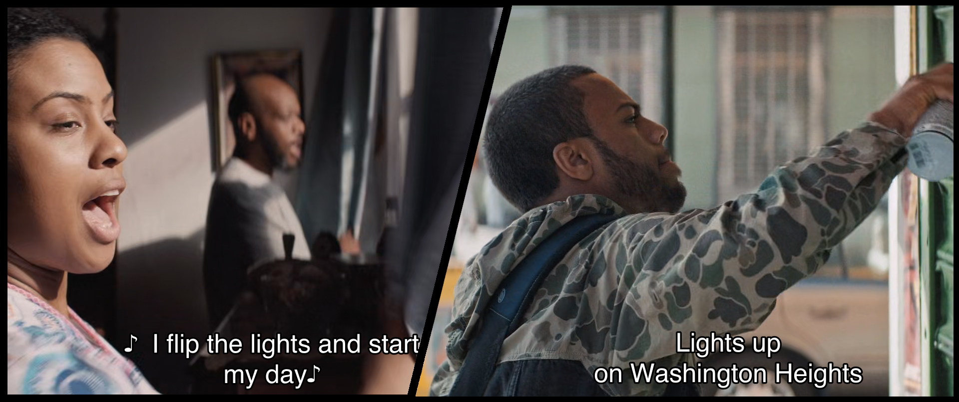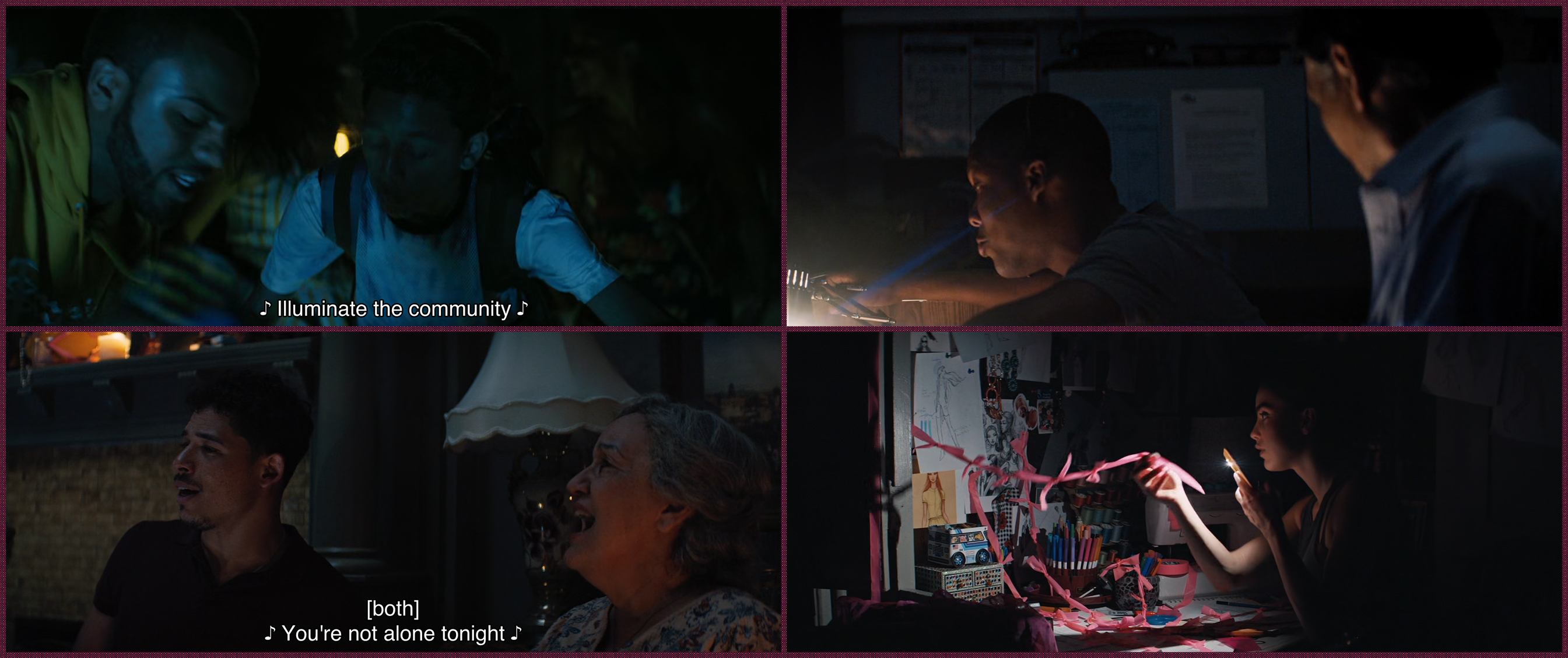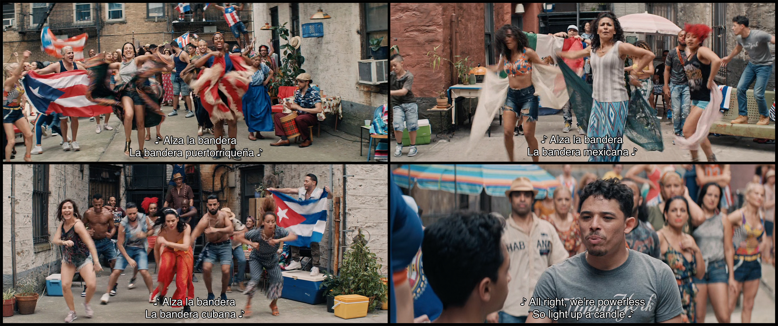 특히 브로드웨이 뮤지컬에서 보다 영화 《인 더 하이츠》에서 정전, 'Blackout'은 빛과 꿈, 공동체를 더 밀접하게 연관시킨다. 빛이 실종되고, 사람들이 혼란에 빠진 와중에도 쏘니와 우스나비의 골칫거리 그래피티스트 피트(Noah Catala 분)는 거리를 불꽃으로 밝히기 위해 노력하며, 케빈이 회사를 처분하면서 실업자가 된 베니는 교통혼잡 상황을 보고 케빈의 회사로 뛰어가 무선 마이크를 들고, 다니엘라와 칼라, 우스나비는 혼자 있을 아부엘라를 걱정하며 찾아가고, 바네사는 깜깜한 도시 속에서 디자인에 대한 영감을 얻는다. 그들의 머리 위로는 정전의 와중에도 하늘을 밝히는 폭죽이 빛을 뿌리고 있다.