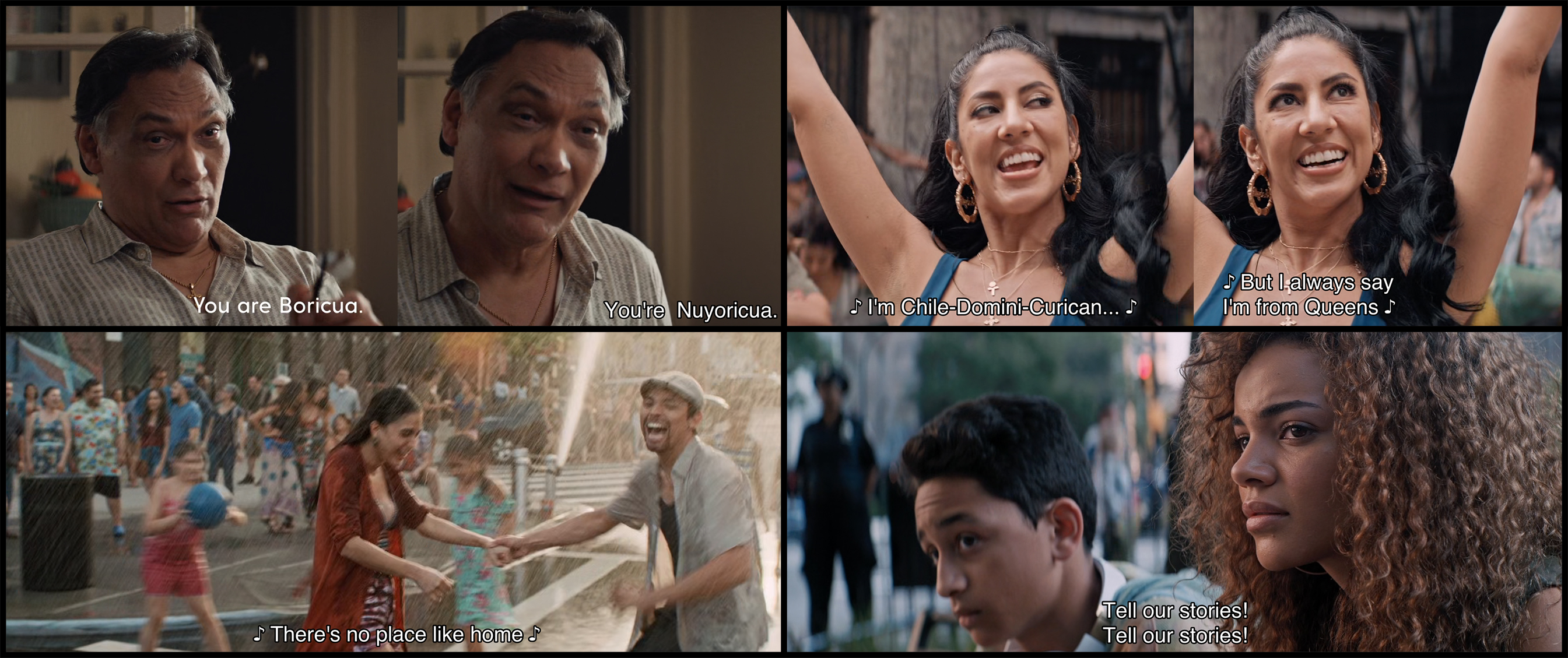 《인 더 하이츠》의 가장 큰 미덕 중의 하나는 워싱턴 하이츠에 거주하는 각각의 구성원들이 새롭게 정체성을 형성하면서 워싱턴 하이츠를 홈으로 만드는 과정이다. 케빈이 딸 니나에게 "너는 보리쿠아(Bricua, 푸에르토리코인)이며" 동시에 "뉴요리쿠아(Nuyoricua, 뉴욕인)"이라고 말하는 장면, 미용실의 칼라가 춤을 추면서 자신의 엄마는 도미니카계 쿠바인이며, 아버지는 칠레 출신이니 자신은 "칠레-도미니카-쿠바인"이지만 동시에 뉴욕의 퀸즈인 이라는 장면은 워싱턴 하이츠에 모여 사는 이민자들이 어떻게 자신의 정체성을 새롭게 빚어 나가는가를 보여준다. 쏘니를 포함해 불법체류 청소년 추방 유예(Deferred Action for Childhood Arrivals, DACA) 프로그램 폐지 반대 시위에 참여한 사람들은 모두 저마다의 이야기(story)를 가지고 있는 사람들이며, 그 이야기들로 워싱턴 하이츠를 홈으로 만들어 간다. 이 미덕을 만들어 가는 영화의 이야기는 하지만 진부한 클리셰 투성이다. 영화의 시작을 수니토란 꿈으로 시작한 것은 아메리칸드림이라는 진부한 클리셰를 재탕한 것에 불과하다. 《인 더 하이츠》는 워싱턴 하이츠를 홈으로 삼으면서 새로운 정체성을 만드는 사람들의 이야기지만 우스나비와 바네사의 딸과 동네 아이들은 수니토란 스페인어가 꿈이라는 의미도 모른 채 부모에게 물어야 하는 세대가 되었다. 그들의 정체성과 꿈은 진부한 미국 신화 아메리칸드림에 포섭될 운명인 것이다.