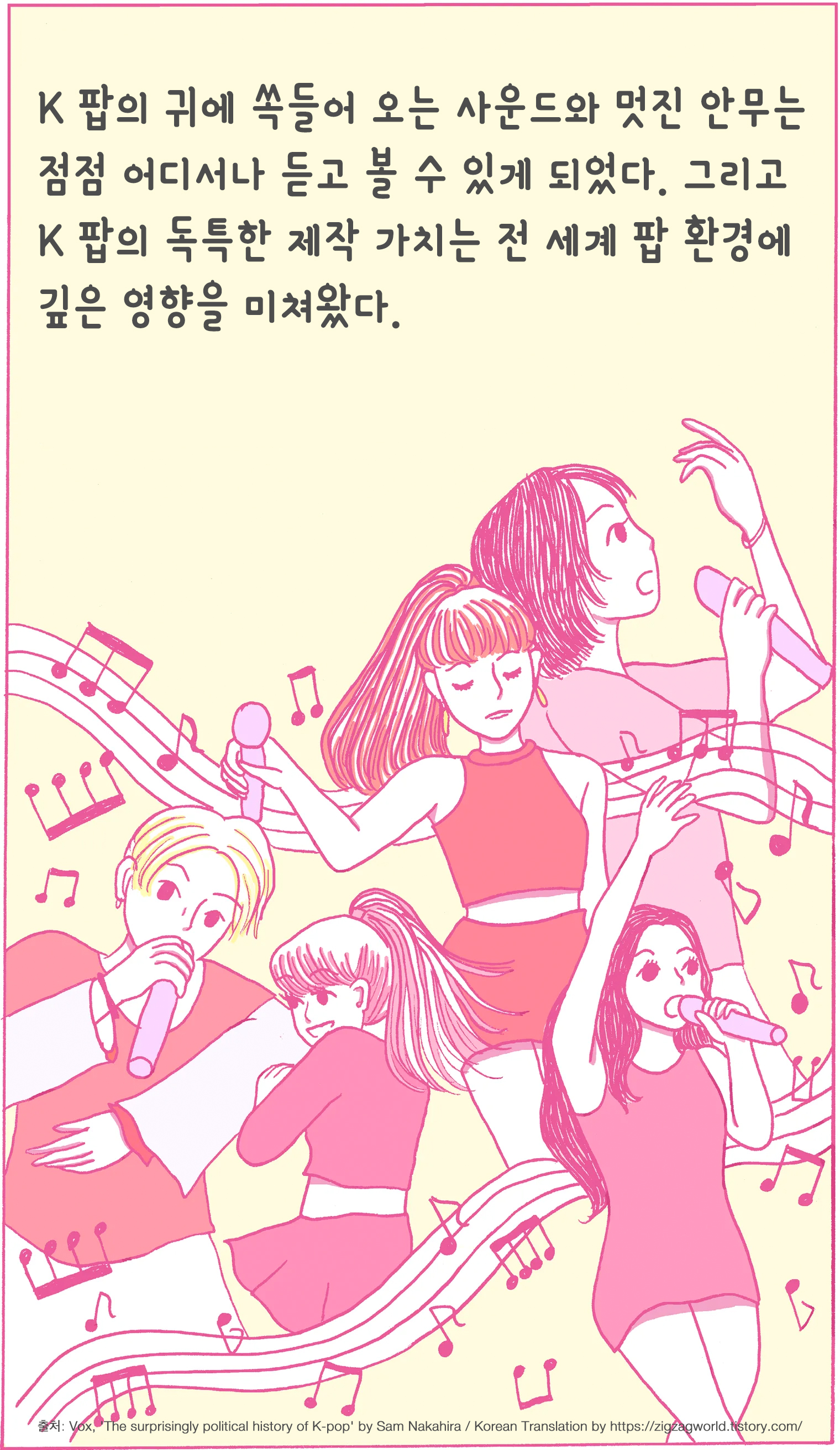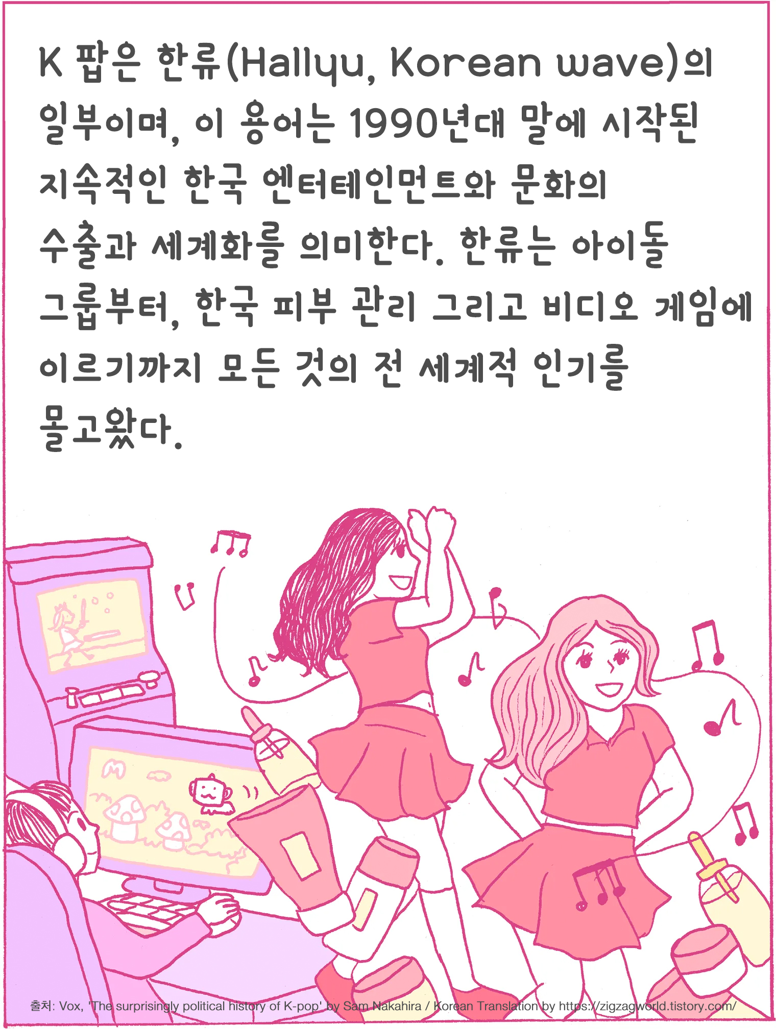 * 이 카툰은 Vox에 Sam Nakahira가 그린 'The surprisingly political history of K-pop'를 번역한 것이다. 이 카툰은 K 팝 역사적 뿌리와 그 배경을 만화의 형식으로 쉽게 그리고 심도있게 다루고 있다. 한류의 한 부분으로 K 팝을 을 알기 쉽게 설명한 이 카툰은 이 문화적 현상 뒤에 있는 한국의 역사, 국제적 지정학, 경제, 문화의 복합적인 힘을 한 눈에 제시한다. 나아가 K 팝이 전 세계 대중문화와 정치에 미치는 영향 그리고 새로운 팬덤문화와 그 내부의 토론까지 잘 보여주고 있다.