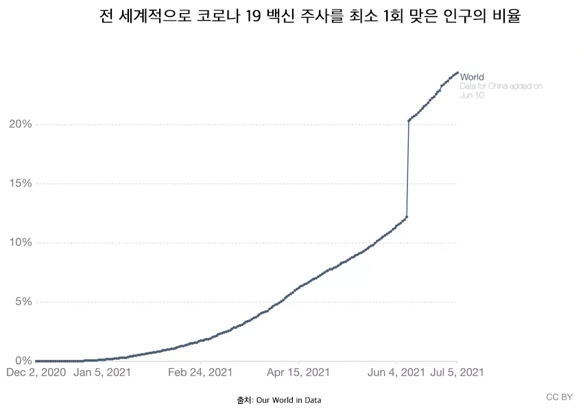 예방 접종을받는 사람들의 수가 계속 증가하고 있다. Our World in Data에서 집계한 수치에 따르면 전 세계 인구의 거의 1/4이 최소 1회 접종을 받았다. 매일 약 3,400만 회의 백신이 투여되어 총 30억 회가 넘는다. 그러나 저소득 국가의 사람들 중 단 1%만이 최소 1회 백신 접종을 받았다.