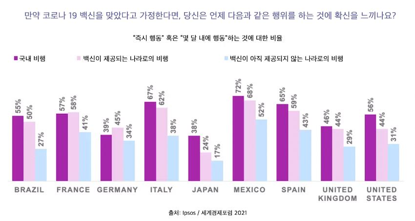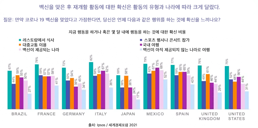 6월 초 세계경제포럼(WEF)과 협력하는 여론조사 회사 입소스(Ipsos)는 9개국 75세 미만 성인 1만 2,497명을 대상으로 설문조사를 실시했다. 참가자들은 자신들의 국가에서 코로나 19에 대한 제한들이 해제되는 시점에 예방 접종을 받았을 것이라고 가정하고 선정되었다.