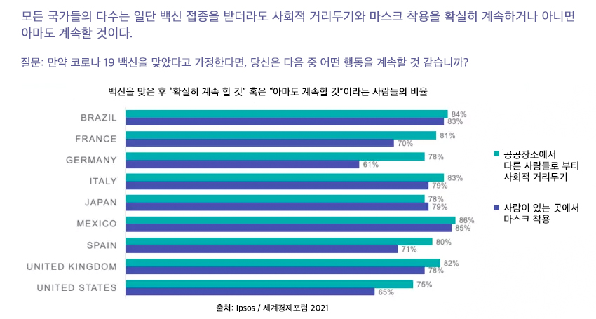 * 역자 주: 이 글은 세계경제포럼(WEF) 코로나 19 소식지에 2021년 7월 8일 자로 게재된 'How will behaviour change after COVID vaccination? New survey reveals post-pandemic trends'의 번역이다. 최근 백신 접종이 계속되는 가운데 감염자 수가 급증하고 이에 따라 수도권 거리두기가 4단계로 격상되면서 다른 나라들에서의 사회적 거리두기와 백신에 대한 관심이 높아졌다. 이 글은 독일, 멕시코, 미국, 브라질, 스페인, 영국, 이탈리아, 일본, 프랑스 9개국의 사람들의 백신과 사회적 거리두기, 마스크 착용에 대한 태도를 보여 준다.