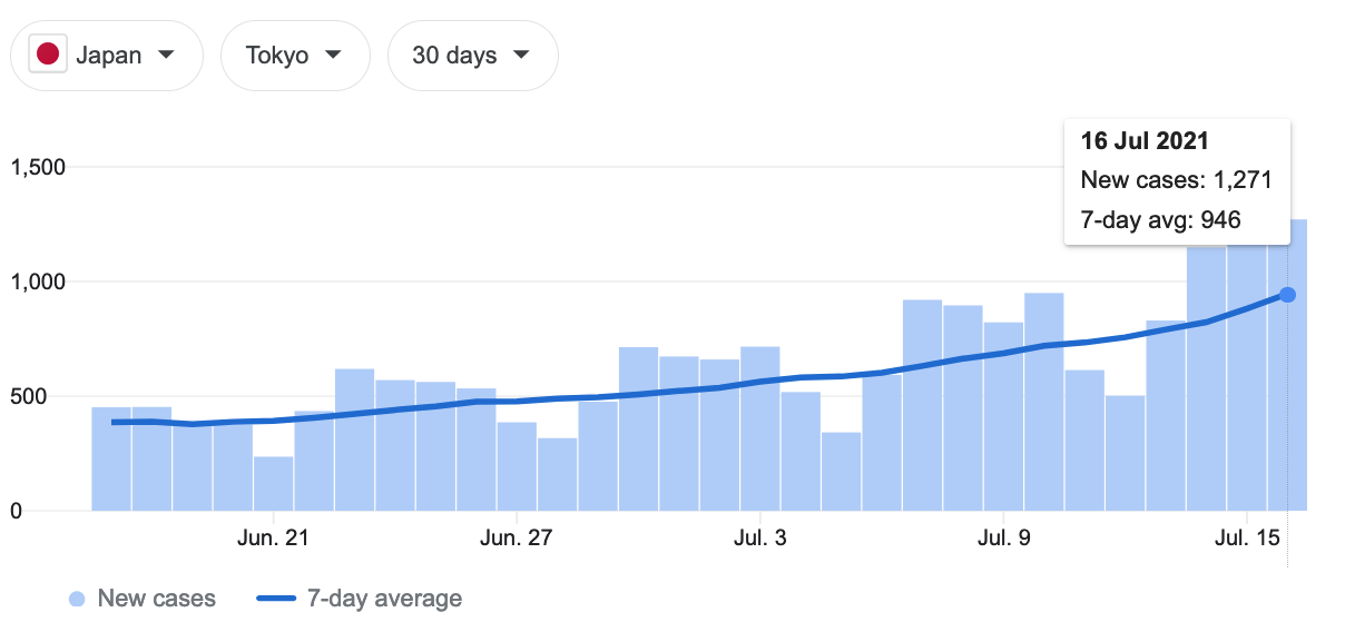 이미 도쿄는 지난 6일 코로나 19 제5파로 비상사태를 선포한 상황이다. 도쿄 올림픽의 안정적 개최를 위해서는 도쿄의 1일 감염자 수가 100명 이하로 내려가야 하지만 도쿄도에서는 7월 17일 코로나 19 신규 감염자가 1,410명이 발생했다. 14~16일에 이어 4일 연속으로 1 천명을 넘어섰다. 지난주 토요일 (10일)에 비해 460명 증가에서 28일 연속으로 전주 같은 요일 감염자 수를 웃돌았다. 17일까지의 1주일 평균 신규 감염자는 1012 명으로 전주의 140.5%였다. 1주일 평균 감염자가 1천 명을 넘는 것은, 코로나 19 제3 파였던 1월 27일 이후 처음이다.