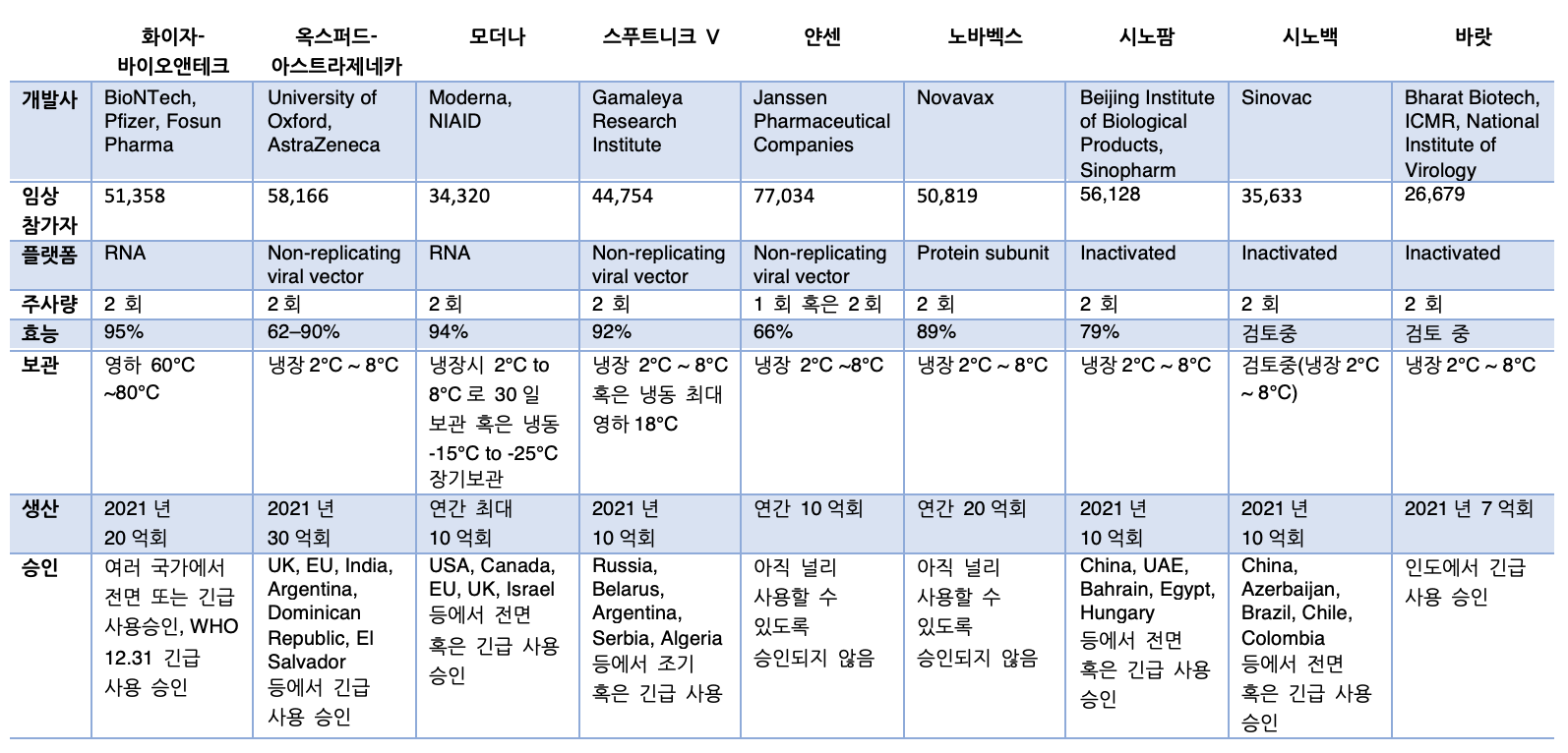 아래 도표는 현재 사용 중인 백신들의 임상 참가 자수, 플랫폼, 주사 횟수, 효능, 보관, 생산량, 승인 여부를 보여준다. 여기서 주의해야 할 것은 제시된 백신의 효능(efficacy)은 임상시험의 유효성이며, 접종 효과(effectiveness)와는 다르다. 옥스퍼드-아스트라제네카 백신은 화이자-바이오앤테크 백신보다 효능이 떨어지는 것으로 알려졌지만, 최근 스코틀랜드 대학과 공공보건청 연구에 따르면 옥스퍼드-아스트라제네카 백신이 화이자-바이오앤테크 백신보다 중증질환을 막는 데 더 효과가 있었으며, 66세 이상 노인들에 대한 면역 효과도 화이자보다 우수했다.