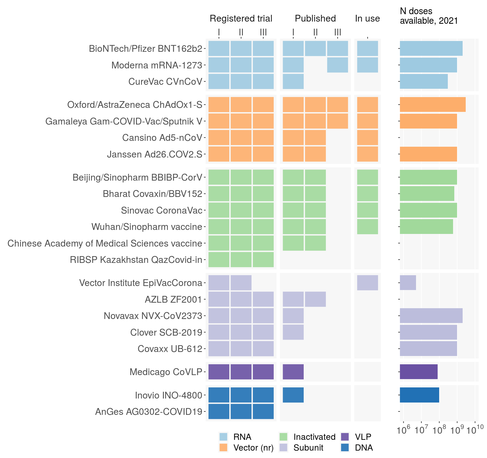 2021년 2월 24일 현재 세계에서 임상 3상 시험이 끝났거나 사용 중인 코로나 19 백신은 아래 그래프에서 보듯이 모두 모두 21종이다. 그 중 임상 3상이 끝나서 사용 중인 백신은 10종이며, 임상 3상이 끝나지 않았지만 사용 중인 백신은 러시아 VECTOR연구소에피박코로나 백신이다. 중국의 CasiCanSinoBiologics 사에서 개발된 Ad5-nCoV백신은 3상 시험이 끝났고 사용 중으로 표시되었지만, 아직 사용 국가가 없다.