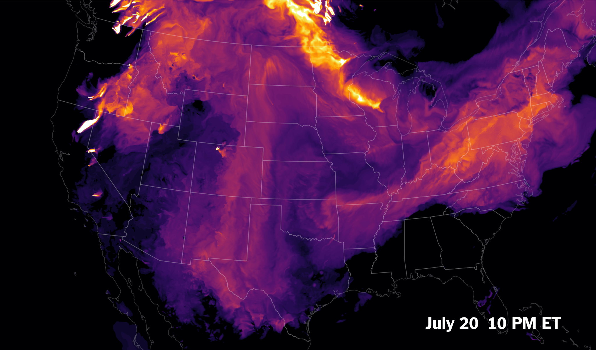 캐나다와 미국 서부에서 발생한 산불 연기는 이번 주 2,000 마일의 대륙을 통과해 동부에 도착해 동부 지역을 짙은 안개 속에 덮어 태양을 붉은색으로 물들였다. 토론토에서부터 필라델피아까지 동부의 도시들은 보건 경보를 발령했으며, 동해안 대부분 지역에서 건강에 해로운 대기의 질이 지속되고 있다. NOAA 모델을 바탕으로 한 아래 지도는 산불의 연기가 전국적으로 어떻게 퍼졌는지 보여준다.