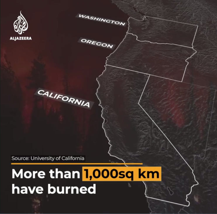 7월 들어 미국과 캐나다 북서부의 전례없는 폭염, 남동부의 돌발 홍수, 사막의 치명적인 몬순에 이어 태평양 북서부의 지독한 건조에 따른 산불이 미국의 캘리포니아, 오레곤, 워싱턴 주와 캐나다의 브리티시컬럼비아주를 휩쓸고 있다. 현재 브리티시컬럼비아주 전역에 300여건의 산불이 발생했으며 지난 이틀간 14건의 산불이 발생했다. 화재의 대부분은 워싱턴과 몬태나 주 경계 부근에 있는 캐나다 남부 제대로 몰려 있다. 현재 미국 13개 주에서 80개 이상의 대형 화재가 발생하고 있다. 캘리포니아에서만 24시간 동안 10만 ㎢가 불에 탔다. 급기야 이 산불들에 의해 발생한 연기가 거대한 미주 대륙을 횡단해 뉴욕 등 미국과 캐나다 동부에 뿌연 하늘과 붉은 태양을 선사했으며, 공기의 질을 악화시키고 있다.