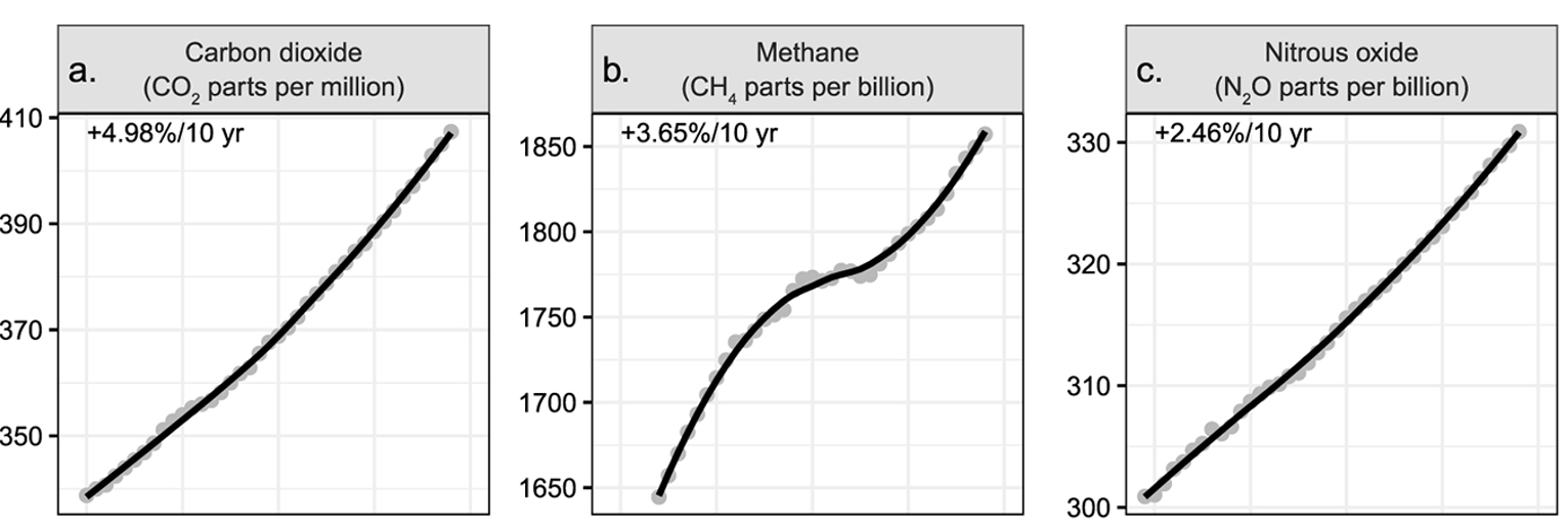 대역병이 경제를 폐쇄하고 일, 학교, 여행에 대한 사람들의 생각을 바꾸었지만, 전체적인 탄소 배출을 줄이는 데는 별 도움이 되지 못했다. 화석연료 사용량은 2020년 소폭 감소했지만, 아래 도표에서 보듯 1979년 이후 이산화탄소, 메탄, 아산화질소가 "2020년과 2021년 모두 대기 중 농도에 대한 새로운 연도의 기록을 세웠다.