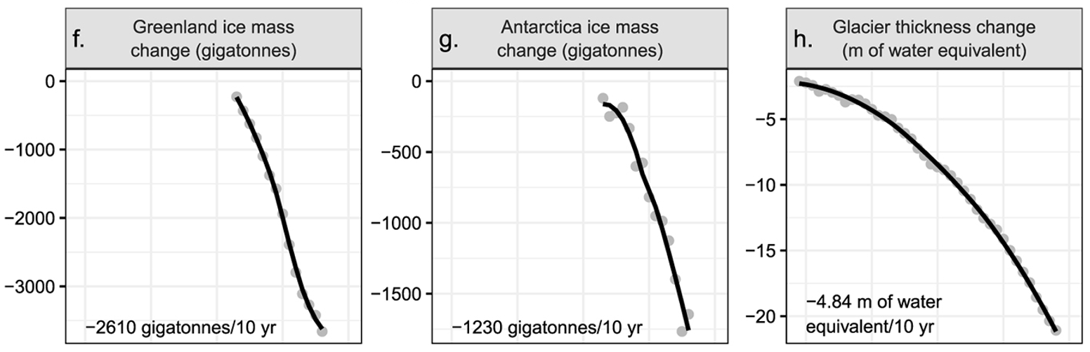 그린란드와 남극은 최근 사상 최저 수준의 얼음 총량과 빙하가 불과 15년 전보다 31% 더 빨리 녹고 있다는 것을 보여줬다고 저자들은 말했다.
