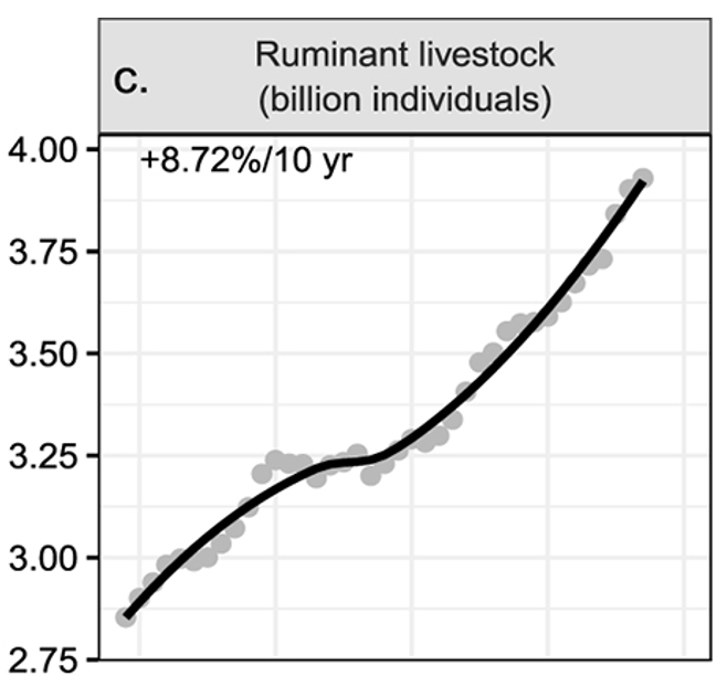 | 1979년 이후 2020년까지 반추동물가축 수 추이 출처: William J Ripple, Christopher Wolf, Thomas M Newsome, Phoebe Barnard, William R Moomaw, World Scientists’ Warning of a Climate Emergency, BioScience , Volume 70, Issue 1, January 2020, Pages 8–12, https://doi.org/10.1093/biosci/biz088 |