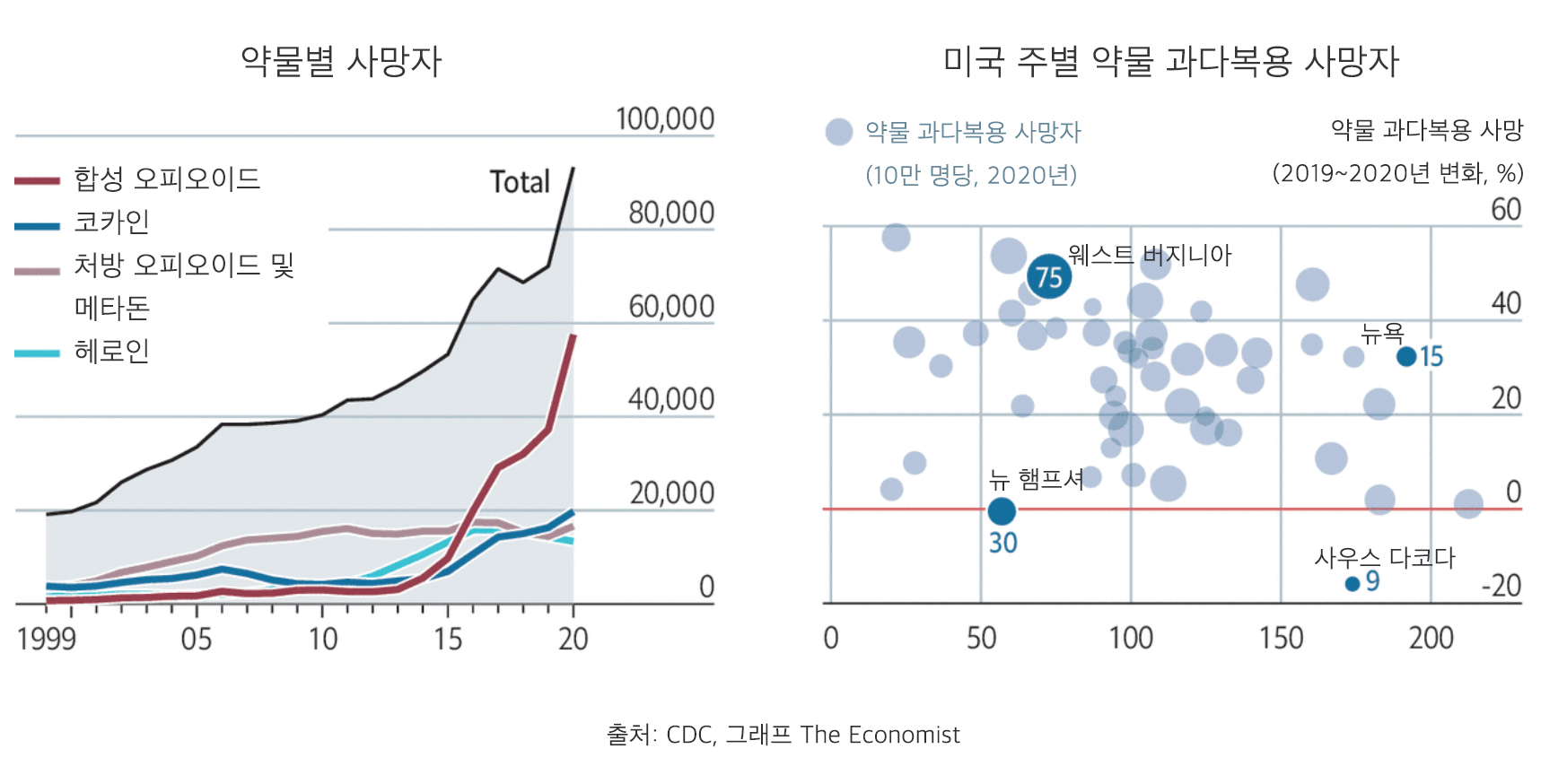 미국 질병통제예방센터(Centers for Disease Control and Prevention, CDC)가 발표한 새로운 자료에 따르면, 지난해 미국에서 약 9만 3천 명 이상이 약물 과다복용으로 사망했는데, 이는 2019년에 비해 약 30% 증가한 기록적인 수치이다. 약물 과다복용으로 인한 사망자는 2020년 코로나 19의 약 4분의 1을 차지했다. 국립약물남용연구소(National Institute on Drug Abuse) 소장인 노라 볼코우(Nora Volkow) 박사는 NPR에 "이는 12개월 동안 기록된 약물 과다복용 사망자 중 가장 높은 수치이며 적어도 1999년 이후 가장 큰 증가율"이라고 말했다.