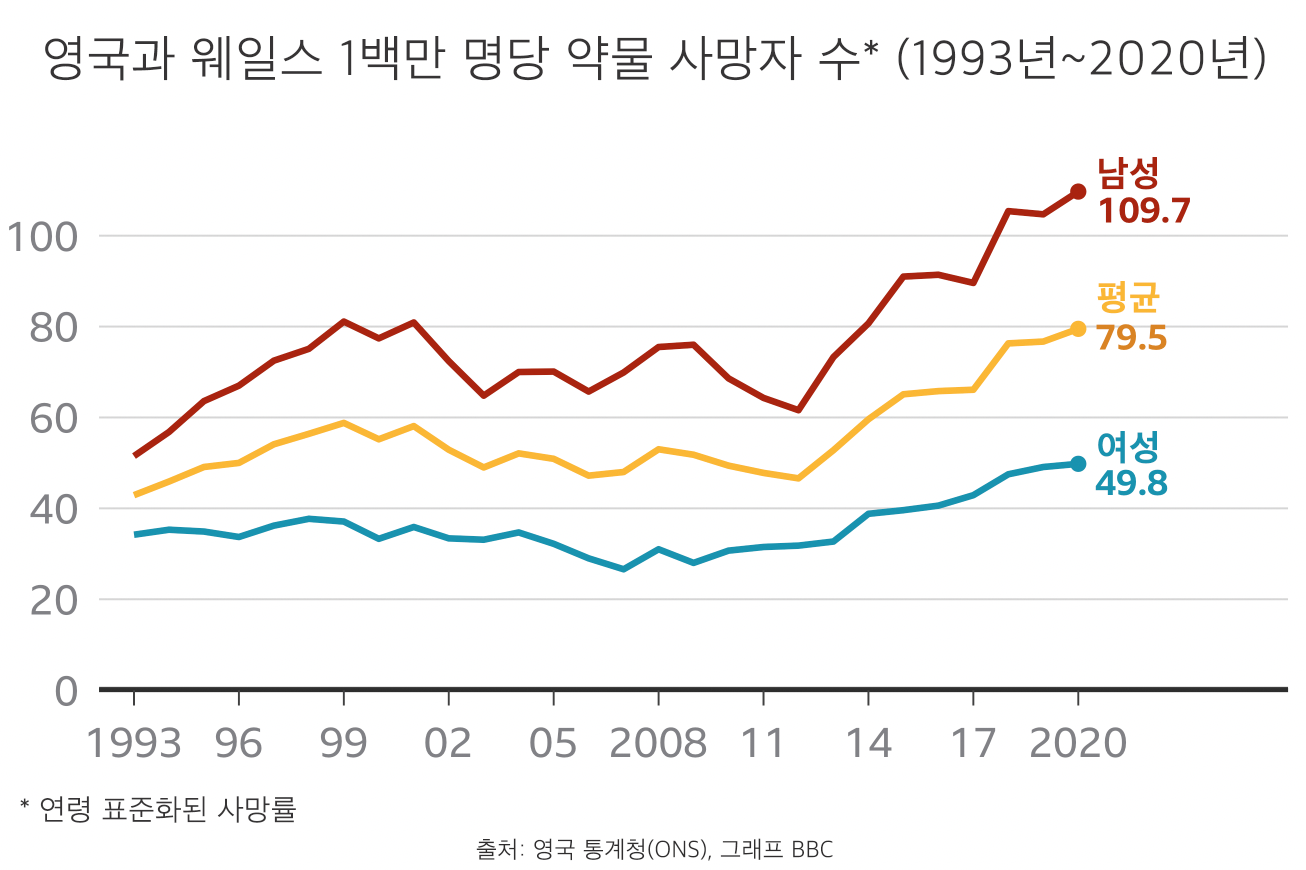 2020년 잉글랜드와 웨일스에서 기록된 약물 관련 사망 건수는 기록이 시작된 1993년 이후 가장 높았다. 영국 통계청(ONS)에 따르면, 2020년에 잉글랜드와 웨일스에서는 약물 중독과 관련된 4,561명의 사망자가 등록되었다(백만 명당 79.5명의 사망자 비율에 해당). 이는 2019년에 등록된 사망자 수(4,393명, 백만 명당 76.7명)보다 3.8% 높은 수치이다.