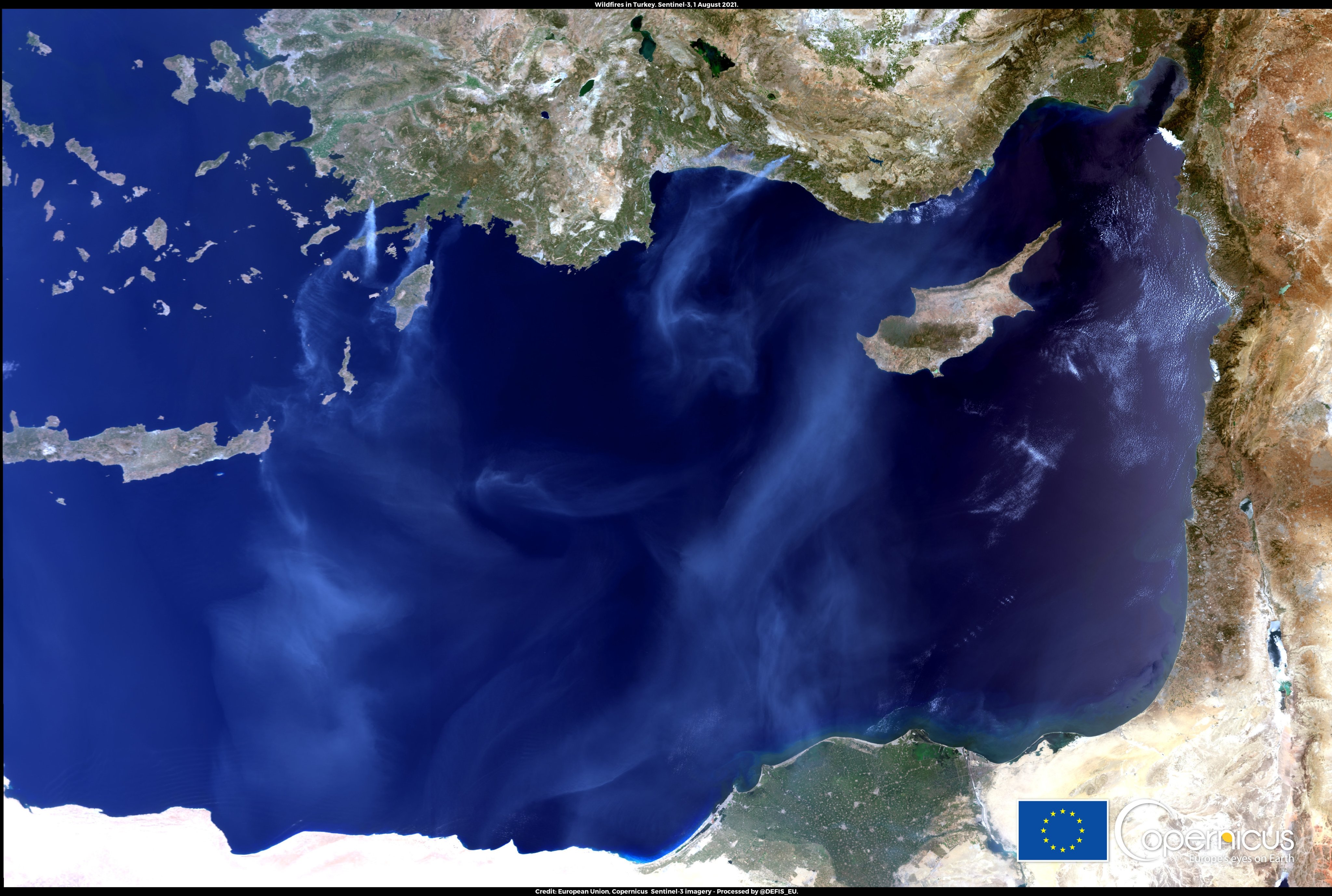 유럽연합(EU)의 코페르니쿠스 대기감시서비스(Copernicus Atmosphere Monitoring Service, CAMS)는 발화원이 필요하기 때문에 높은 온도만으로 산불이 발생하지는 않음에도 불구하고 고온 건조한 기후로 인해 추가 화재의 위험이 높아졌다고 밝혔다. CAM은 위성 및 지상 관측 성명을 통해 산불을 감시하고 있으며 터키와 남부 이탈리아에서 산불의 배출량과 강도가 급격히 증가하고 있다고 밝혔다. 터키에서는 화재 강도의 주요 지표로 나무 및 기타 물질을 태울 때 발생하는 에너지를 측정하는 "화재 복사력"(fire radiative power)이 2003년 데이터 기록이 시작된 이후 가장 높은 일일 값에 도달했다.