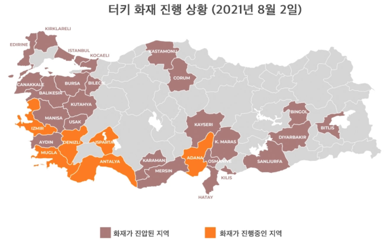 한국 여자 배구가 터키 팀에 승리한 이후 화재로 불타고 있는 자신의 조국에 승리 소식을 알리고 싶었던 터키 선수들은 주저앉아 눈물을 흘렸다. 한국 여자 배구 팬들은 터키 선수들을 위로하고 그들이 조국에 자그마한 도움이라도 주기 위해 묘목을 위한 모금에 적극 참여하고 있다. 터키의 산불이 한국까지 알려지게 된 것은 물론 여자 배구 경기 때문이기도 하지만 다른 한편으로는 인구 8,500만 명의 터키에 소방 항공기가 한 대도 없었다는 점, 즉 중앙정부의 무방비와 무력함 속에서 산불로 피해를 입고 있는 지역의 시장들이 소셜 미디어를 통해 적극적으로 도움을 요청했기 때문이다. 불타는 터키는 기후 변화의 산물이자 동시에 터키 중앙정부의 실패로 인해 더 심각해지고 있다.
