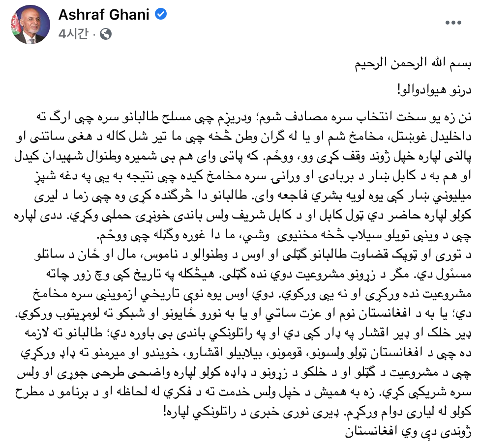 탈레반은 카불에서 아프가니스탄 전쟁이 "끝났다"(over)라고 발표했다. 미국은 또 다른 1,000명의 군대를 카불에 직접 파견하여 미국 국민과 아프간 지원 직원의 안전한 철수를 실행하기 위해 아프가니스탄에 예상되는 미군 수를 최대 6,000명으로 늘리고 있다. 아프가니스탄의 아슈라프 가니 전 대통령이 이웃나라 우즈베키스탄의 수도 타슈켄트로 도피한 것으로 알려졌다. 가니는 페이스북에 자신이 카불에서의 유혈 전쟁을 피하기 위해 탈레반이 거의 전투 없이 통제할 수 있도록 하기 위해 나라를 떠났다는 뜻밖의 메시지를 페이스북에 올렸다.