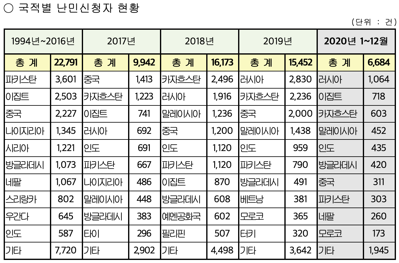 한국의 난민 신청자 현황을 보면 2017년 이후로는 카자흐스탄과 러시아가 난민 신청자가 제일 많은 것으로 나타났다.