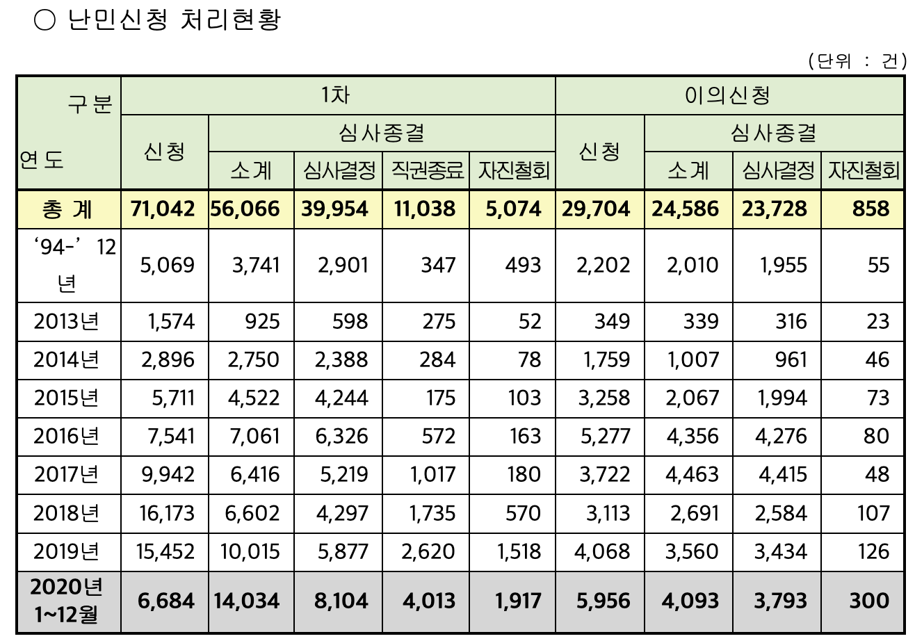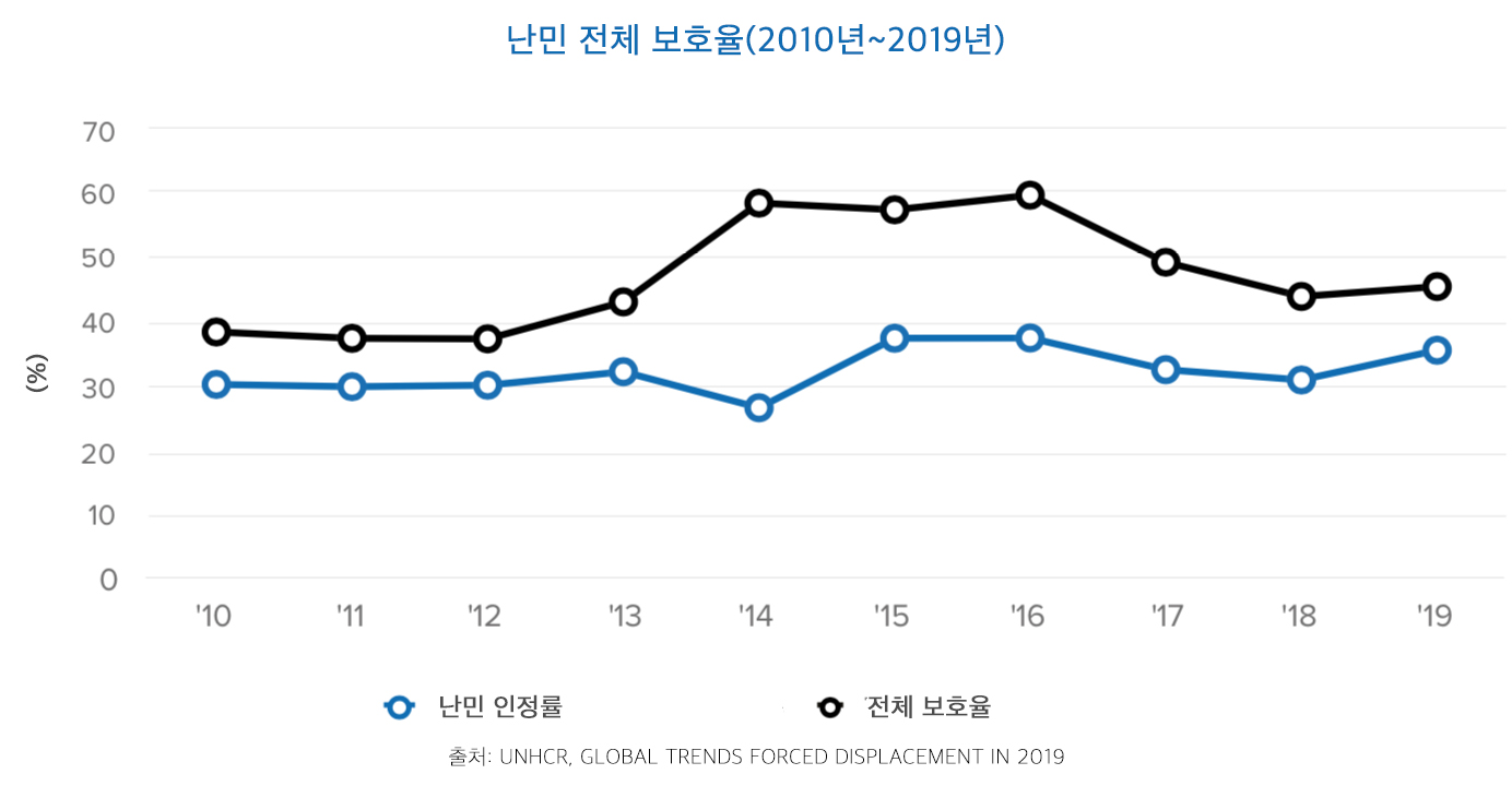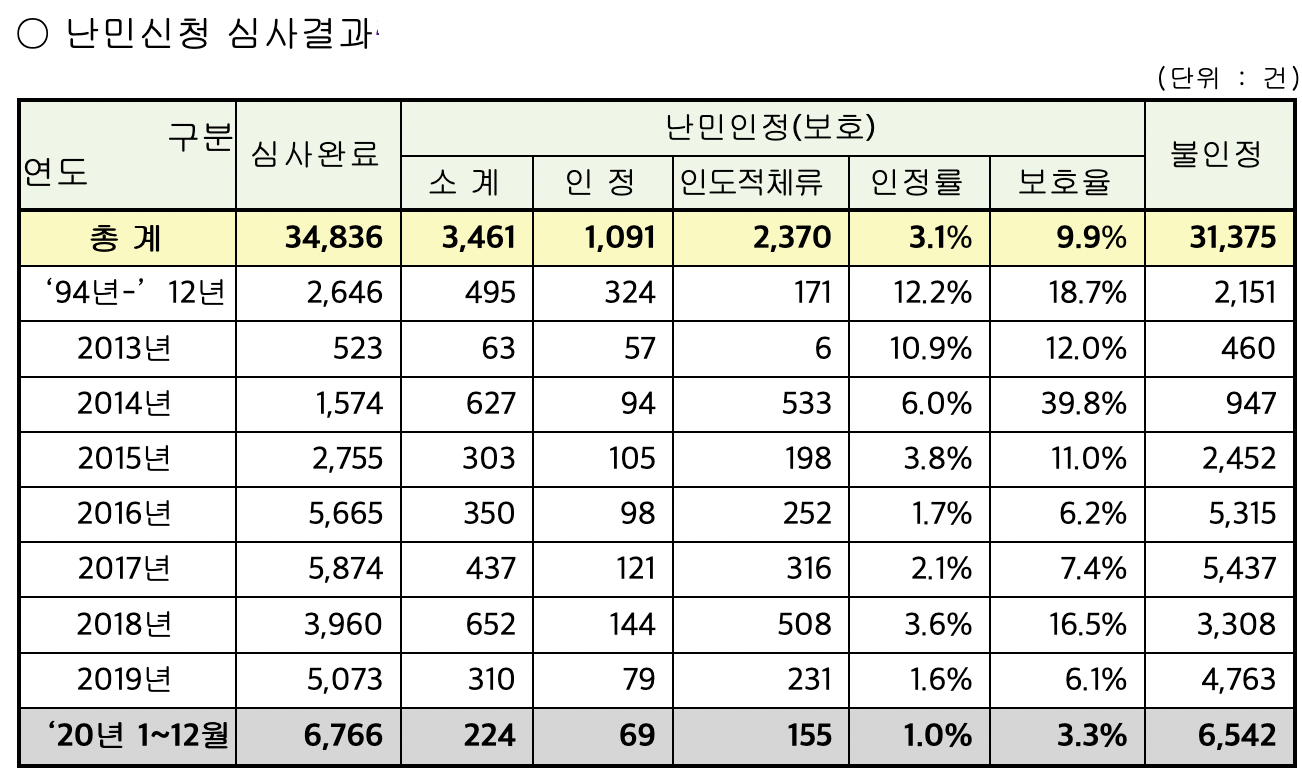 하지만 한국의 난민 인정률은 1994년~2020년까지 3.1%, 난민 지위보다 한 단계 낮은 인도적 체류에 해당하는 보호율은 9.9%이다. 최근 5~6년 사이 인정률은 1.6%~3.6%로 낮은 편이다. 난민 인정률과 보호율을 모두 합친 전체 보호율(Total protection rat)의 1994년~2020년 평균 합계는 13%(난민 인정률 3.1% + 보호율 9.9%)이며, 2020년 비율은 4.3%이다.