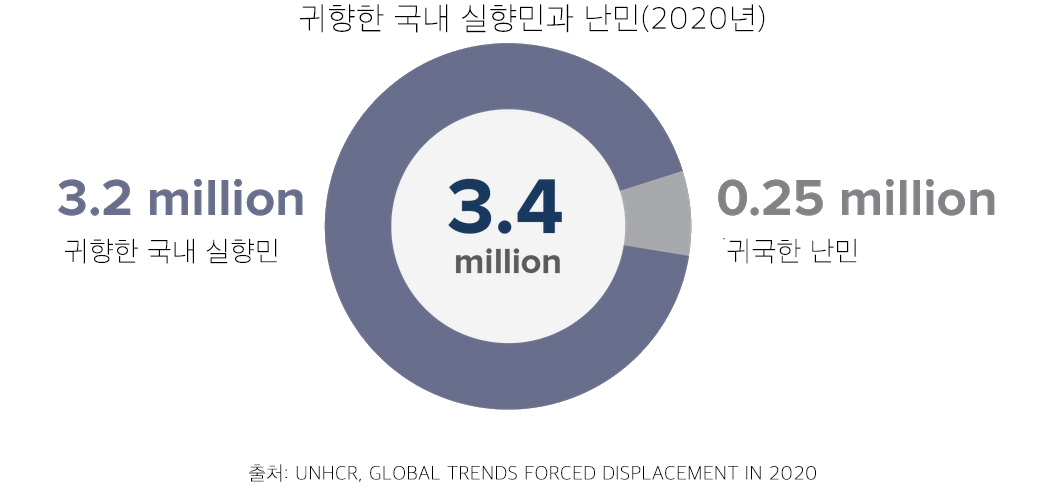 난민들은 해결책을 찾기 위해 고군분투하는 유일한 강제 실향민이 아니다. 2019년의 530만 명과 비교하여 40% 적은 320만 명의 국내 실향민(internally displaced people, IDP)이 거주지로 돌아갈 수 있었고, 수백만 명의 국내 실향민이 장기 실향민이 되었다. IDP 반환의 거의 절반이 콩고 민주 공화국(140만)에 집중되었다.
