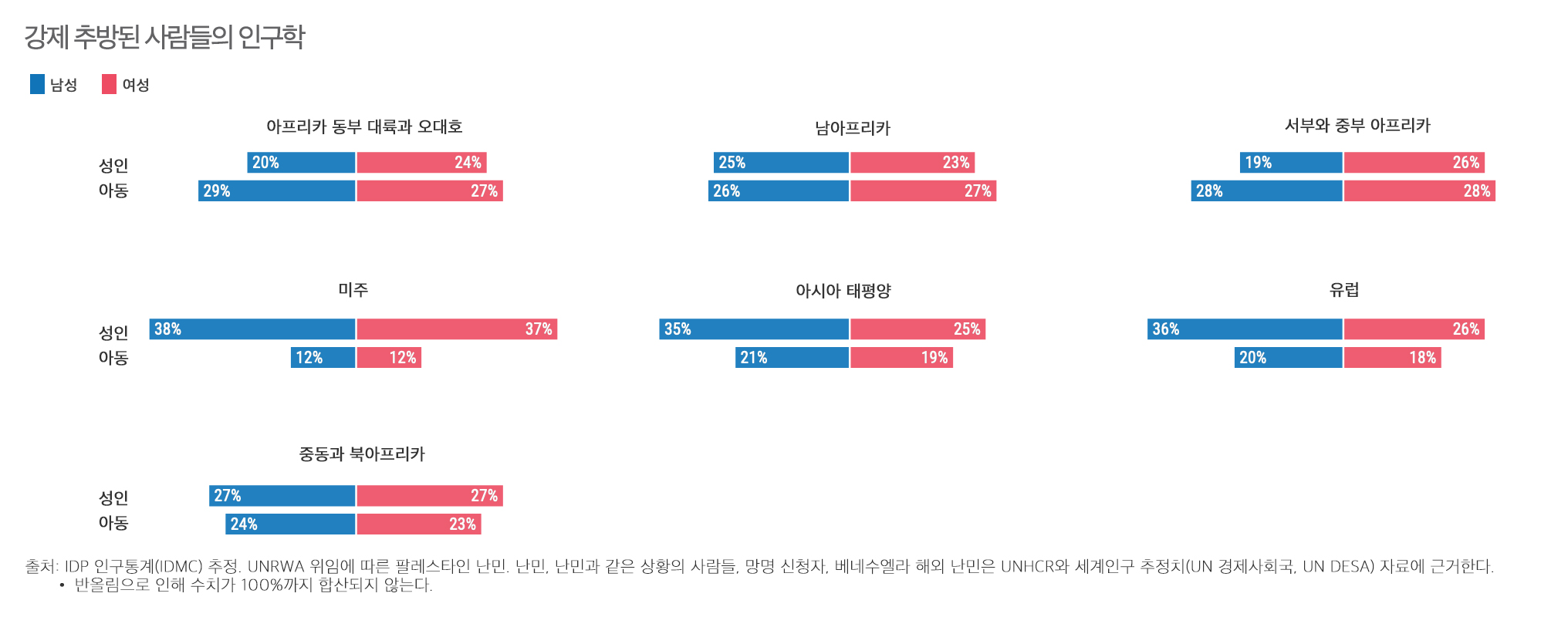 난민과 베네수엘라 해외 난민의 망명 지역을 고려할 때 사하라 사막 이남의 3개 지역이 난민 아동 비율이 가장 높은 것으로 나타났다. 서부 및 중앙아프리카에는 다른 어떤 지역보다 특히 많은 난민 여성과 소녀(54%)가 있다.