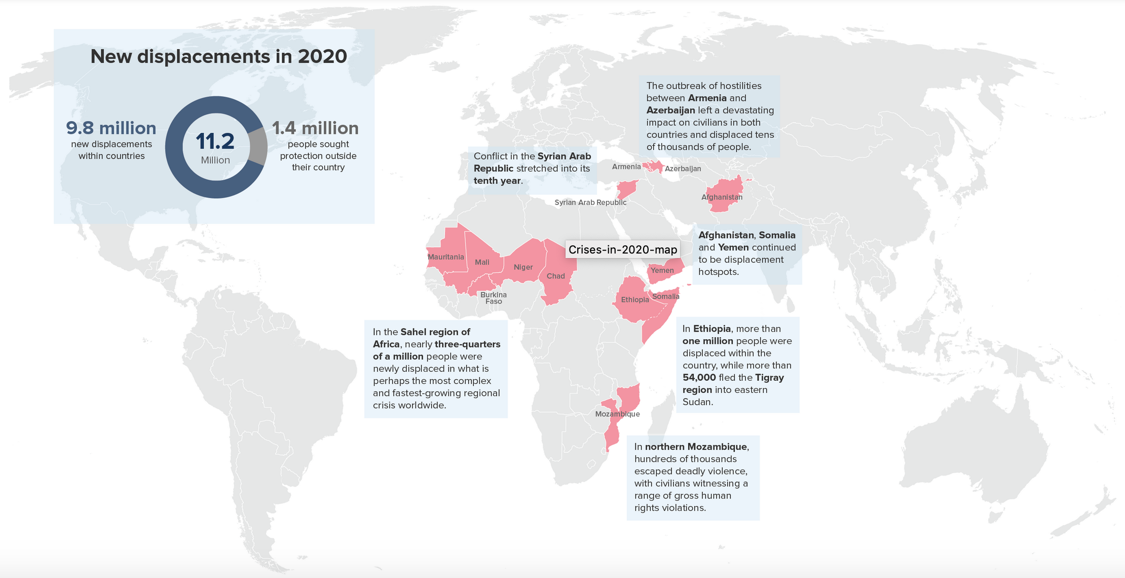 2019년에는 1,100만 명이 탈출했던 것과 달리 2020년에는 몇 가지 새로운 위기, 몇 가지 오래 지속된 위기, 그리고 몇 년 만에 다시 닥친 위기 등 여러 차례에 걸쳐 1,120만 명이 피난길에 올랐다. 이 수치에는 처음 고향을 떠나야 했던 사람들뿐만 아니라 국내와 해외에서 반복적으로 실향된 사람들의 수도 포함된다.