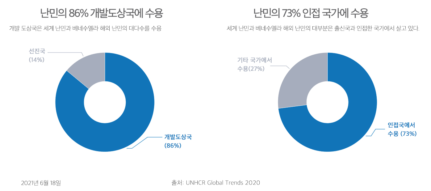 서구 언론의 대대적인 난민 수용 선전에도 불구하고 세계 난민의 86%는 개발도상국에 의해 수용되고 있다. 특히 난민이 주로 발생하는 국가의 인접국가들은 이들 난민의 절대 다수인 73%를 수용하고 있다.