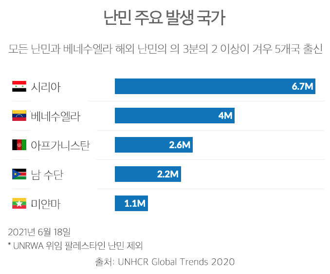 팔레스타인을 제외하면 전 세계 난민의 약 68%가 시리아, 베네수엘라, 아프가니스탄, 남수단, 미얀마의 5개국에서 발생했다.