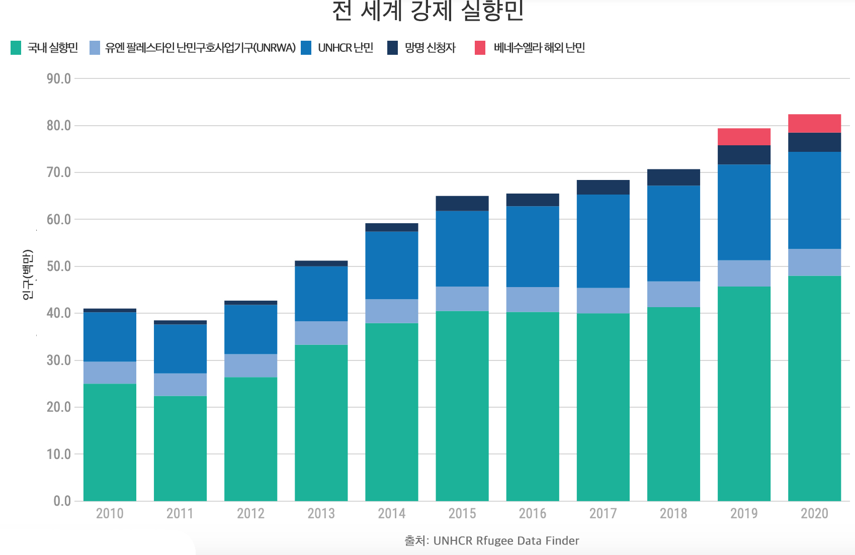 박해, 분쟁, 폭력, 인권 침해 및 공공질서를 심각하게 교란하는 사건의 결과로 2020년 말에 전 세계적으로 8,240만 명의 강제 실향민이 발생했다.