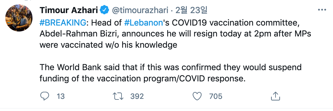 세계은행으로부터 약 3천 4백만 불의 대출 지원을 받아 2월 14일부터 백신 접종을 하던 레바논은 국회의원들의 새치기로 한때 백신 접종이 중단됐다. 의료종사자와 76세 이상 노인들에게 접종하기로 되어 있던 레바논 보건당국의 방침은 접종 첫날 40%밖에 이행되지 않았다. 레바논 의원들 가운데 16명과 5명의 의회 스태프들이 백신 접종을 받았지만, 그들 중 일부는 76세 미만임이 밝혀졌다.