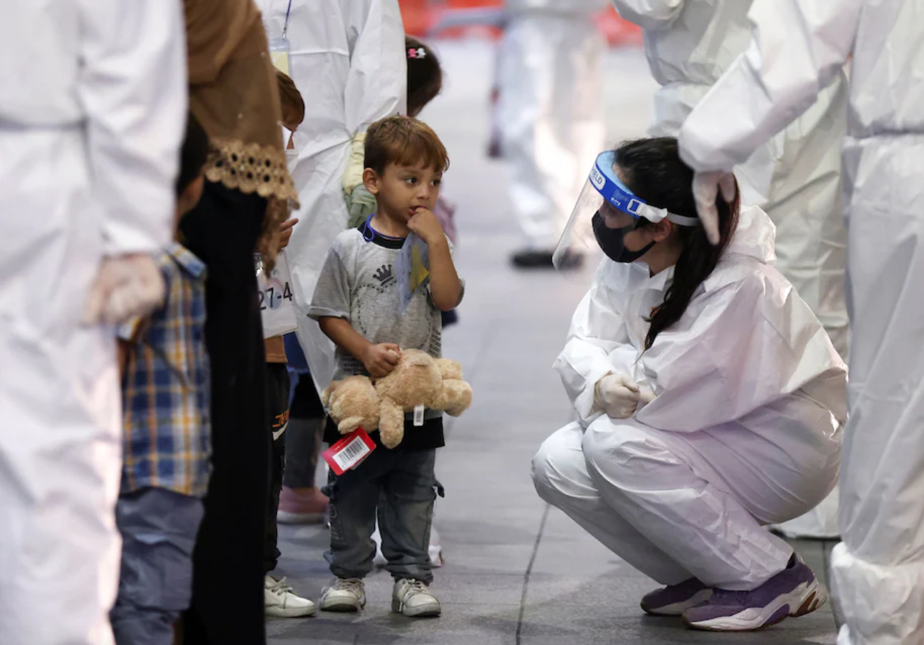 수백 명의 아프간인들이 도착한 한국 인천 국제공항에서 어린이들은 흰색과 분홍색 테디베어를 받았고 환영 현수막을 보았다. 이들은 이민자에 대한 학대를 막기 위해 당국에 의해 난민이 아니라 "특별 기여자"(persons of special merit)로 불렸다. 약 390명의 사람들이 최대 90일 동안 유효한 단기 체류 비자를 받았고, 지역 언론은 이들이 장기 비자로 전환될 가능성이 있다고 보도했다.