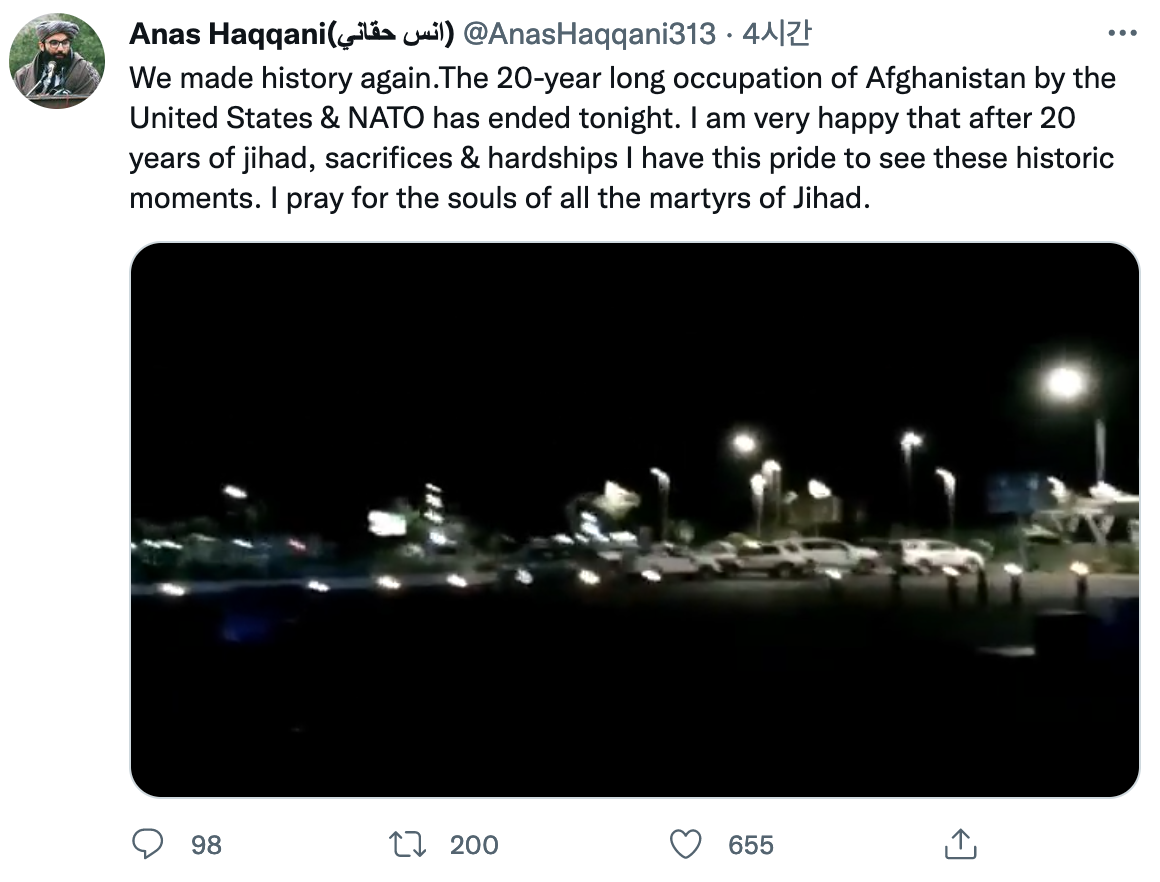 유명한 잘랄루딘 하카니(Jalaluddin Haqqani) 무자헤딘 사령관의 아들이자 파키스탄-아프가니스탄 국경을 가로지르는 탈레반의 금융 및 군사 자산을 감독하는 느슨한 조직인 하카니(Haqqani) 네트워크를 이끌고 있는 시라주딘 하카니(Sirajuddin Haqqani)의 동생인 아나스 하카니(Anas Haqqani)는 "우리는 다시 역사를 만들었습니다. 미국과 나토의 20년 동안의 아프가니스탄 점령이 오늘 밤에 끝났습니다. 20년 동안 지하드, 희생, 고난을 겪은 후 이 역사적인 순간을 볼 수 있다는 자부심을 갖게 되어 매우 기쁩니다. 지하드의 모든 순교자들의 영혼을 위해 기도합니다."라는 트윗과 함께 탈레반 전사들이 20년 점령의 종식을 축하하는 동영상을 올렸다.