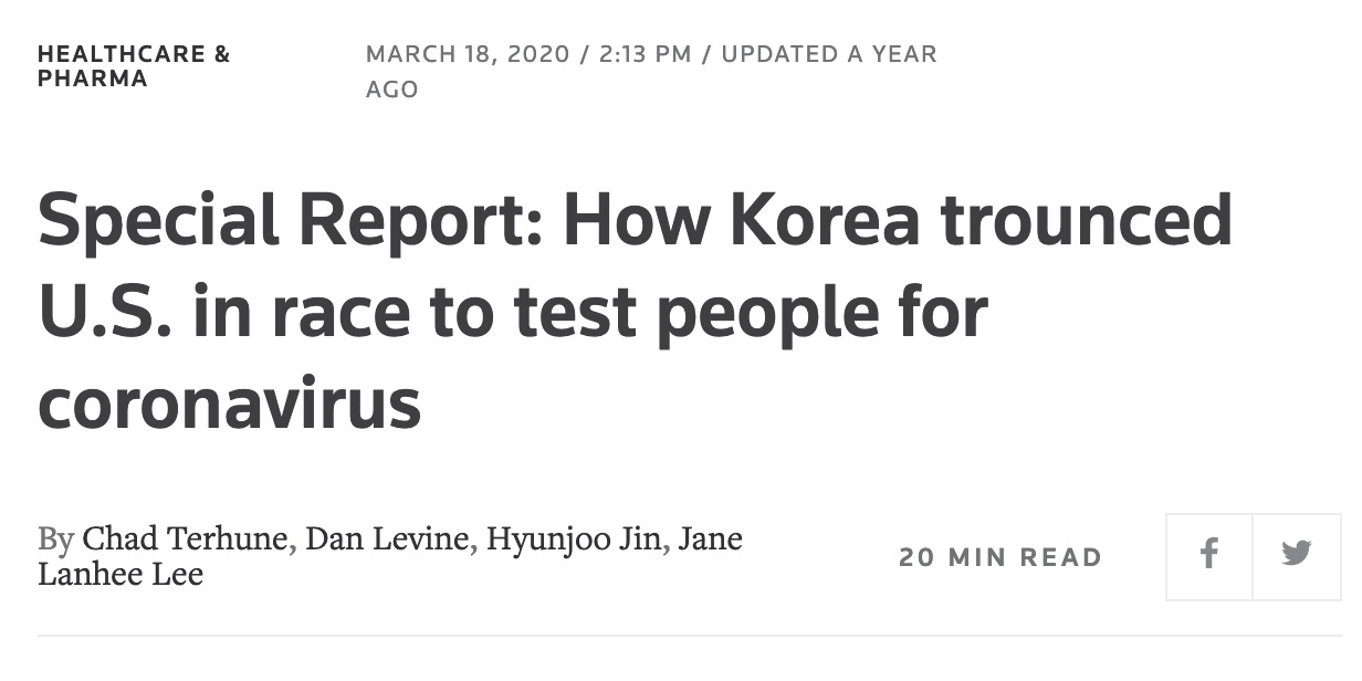 '코로나바이러스 검사 경쟁에서 한국은 미국을 어떻게 완파했나'는 로이터의 2020년 3월 18일 자 특별 리포트는 K-방역을 전 세계에 알리는 첫 신호였지만, 동시에 미국의 방역 참담한 실패를 알리는 신호이기도 했다. 특히 이 보고서의 "한국과 같은 날 첫 사례가 발견된 미국은"이란 구절은 미국의 코로나 19 대응 실패를 비판하는 미국 언론과 정치인들이 즐겨 인용하는 문구가 되었다.