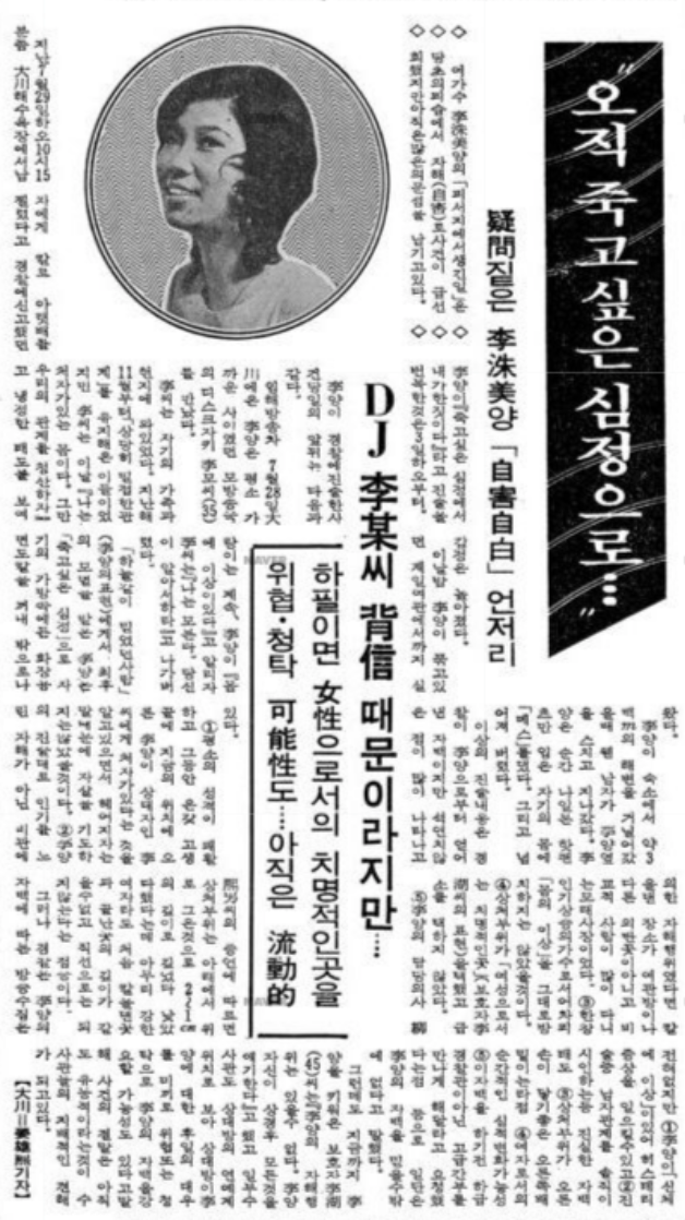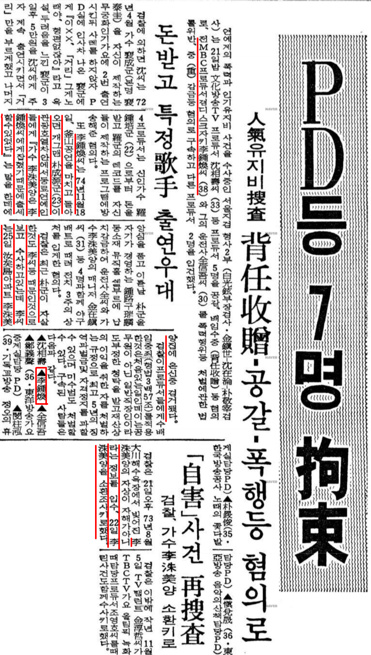1975년 4월 22일 조선일보 사회면을 크게 장식한 사건은 방송사 PD 등 7명의 구속이었다. 방송사 PD들이 돈을 받고 가수들의 방송 출연을 좌우했다는 것이다. 그런데 그 바로 아래 어제 작고한 가수 고 이수미 씨 기사도 보인다. 이 두 사건에는 공통적으로 등장하는 인물들이 있었는데 바로 가수 이수미 씨와 PD이자, DJ인 이종환이다.