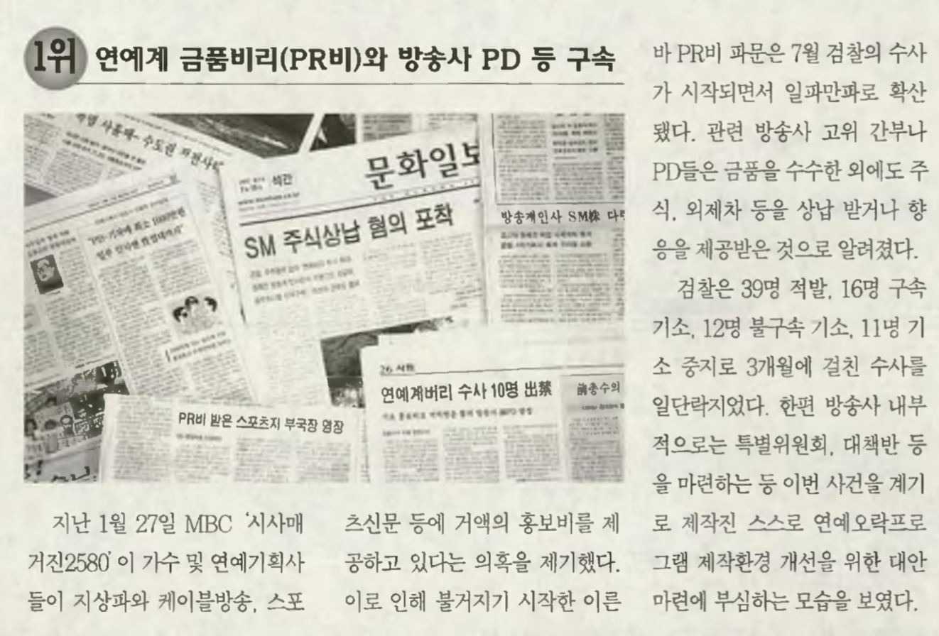 이러한 연예계 비리는 2002년에도 발생했다. PD들의 금품 수수 외에도 그들에 대한 주식, 외제차 제공이 폭로되었다. 이 사건은 16명이 구속 기소되고, 12명이 불구속 기소되는 대형사건으로 2002년 그해의 뉴스 1위를 차지했다.