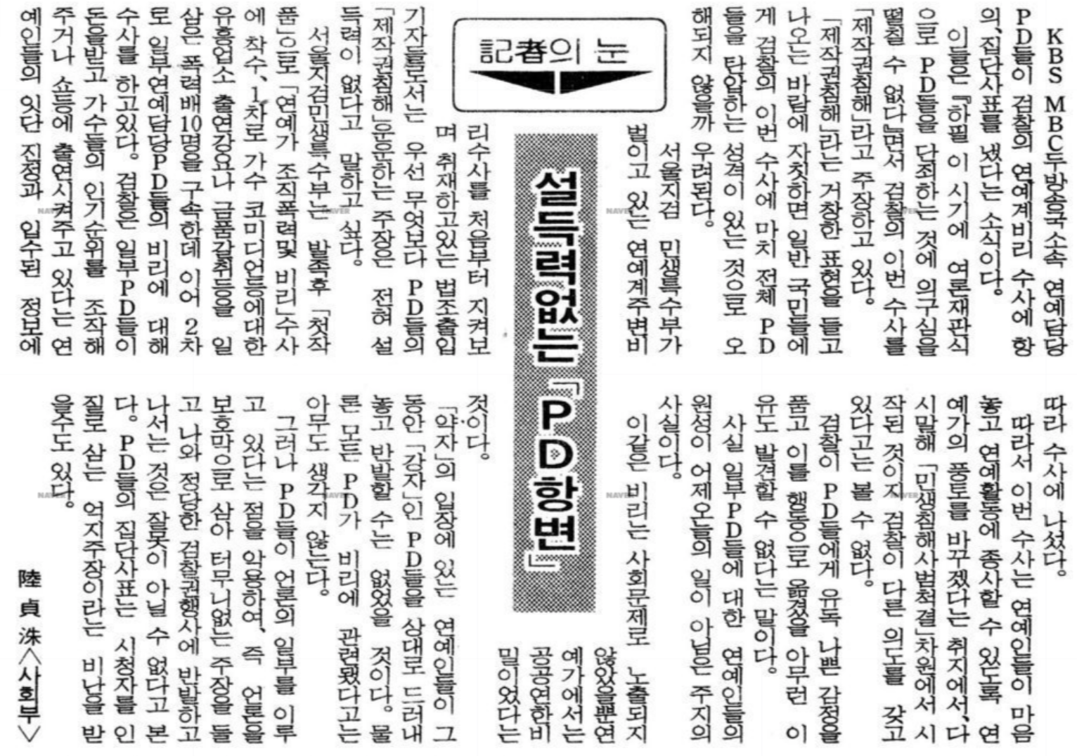 연예계 비리는 거의 10년 주기로 터지곤 한다. 1990년 KBS와 PD들은 검찰의 연예비리 수사에 항의하며 집단 사표를 제출했다. 검찰 수사에 따르면 조직 폭력배들의 연예인의 업소 출연 강요와 금품갈취 그리고 연예담당 PD들의 가요 인기 순위 조작과 방송 프로그램 출연을 미끼로 노골적으로 금품을 수수했다.