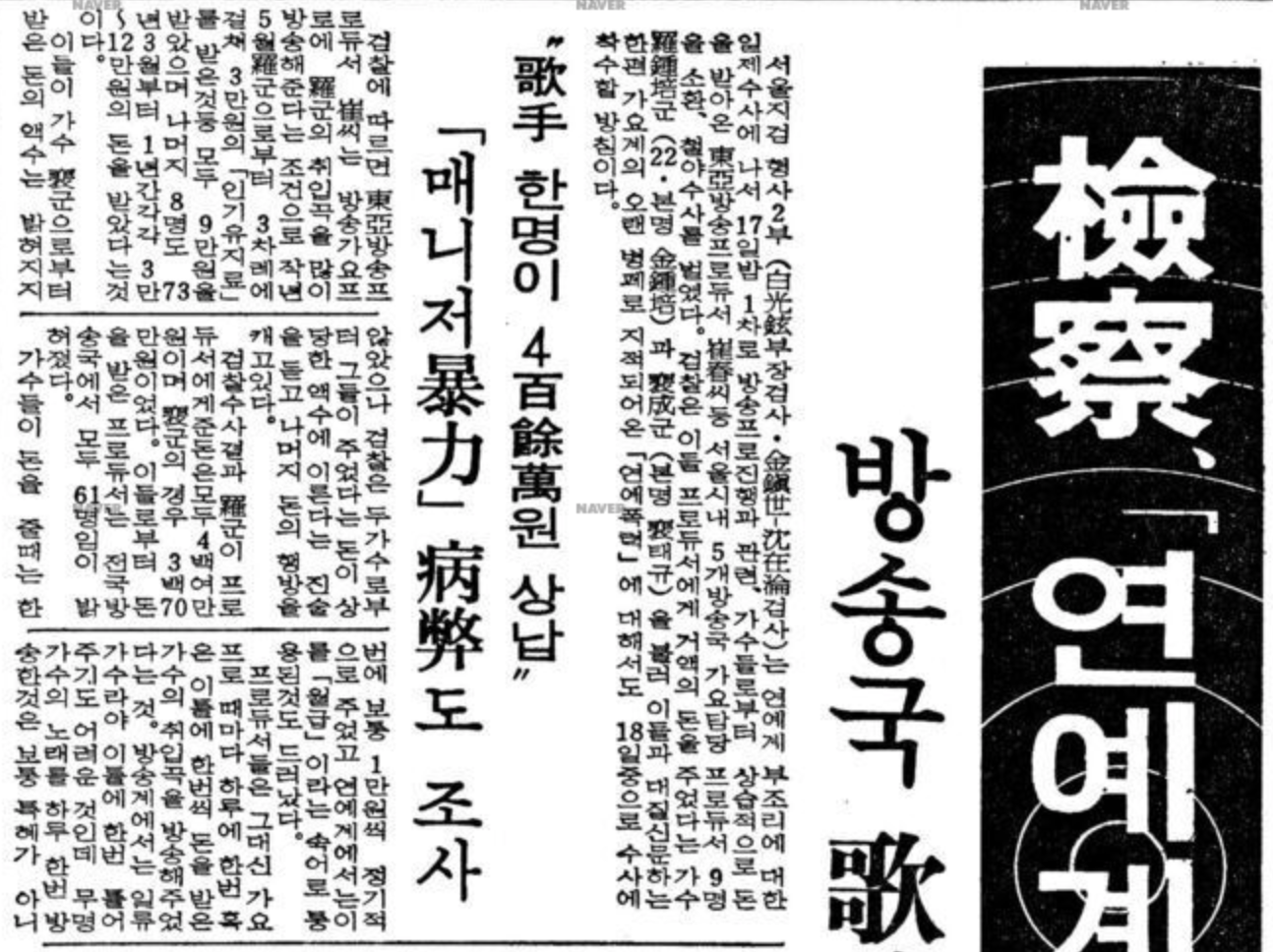 예나 지금이나 엔터테인먼트 산업의 가장 큰 3대 문제점은 폭력, 비리(금품과 성문제), 약물이었다. 밤무대, 방송 프로그램, 기획사 등 메커니즘은 시대에 따라 다르지만 이 3대 문제점은 예나 지금이나 엔터테인먼트 산업의 불투명성, 독특한 시장구조, 이익을 둘러싸고 벌어진다는 점에서 거의 유사하다.