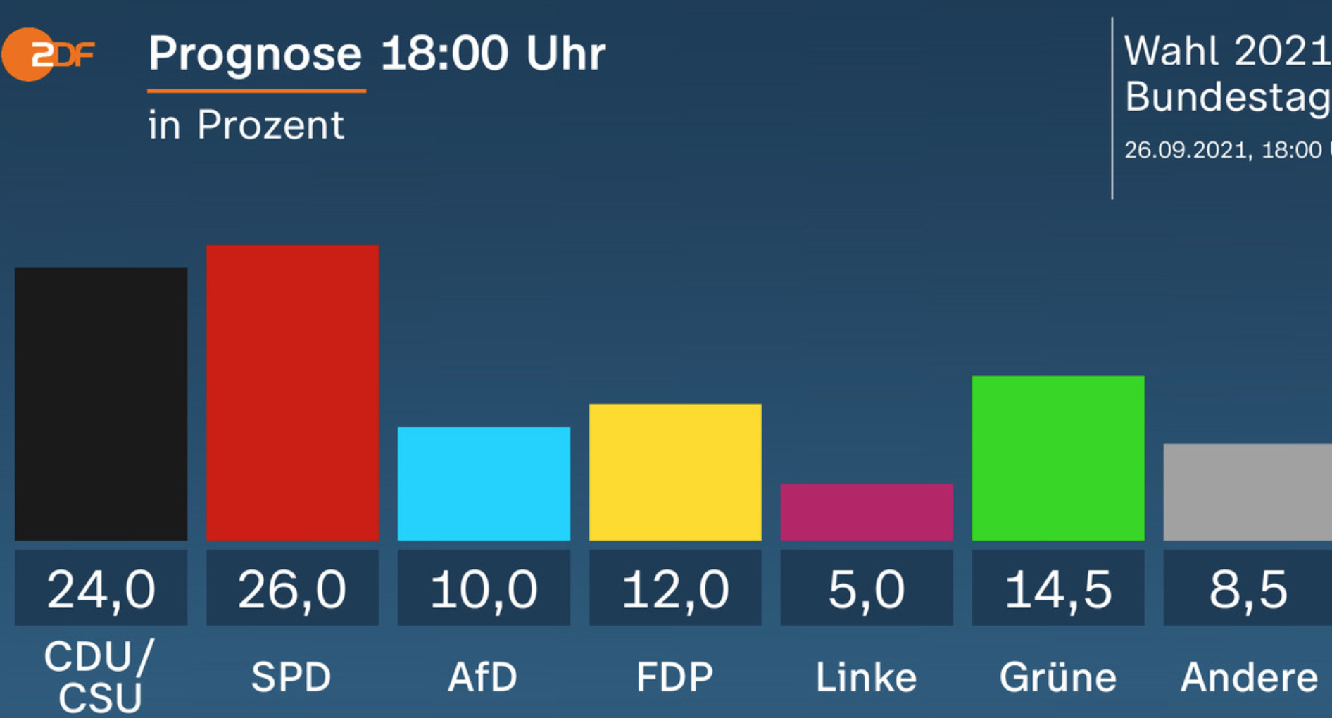 아래 제2 방송(ZDF)의 출구조사 그래프를 보면 사민당은 26%, 기민련/기사연 연합(CDU/CSU)은 24%, 녹색당(Grüne)은 14.5%, 자민당(FDP) 12%, 독일을 위한 대안(AfD)는 10%, 좌파당(Linke)은 5%, 기타 8.5%를 얻는 것으로 예측됐다.