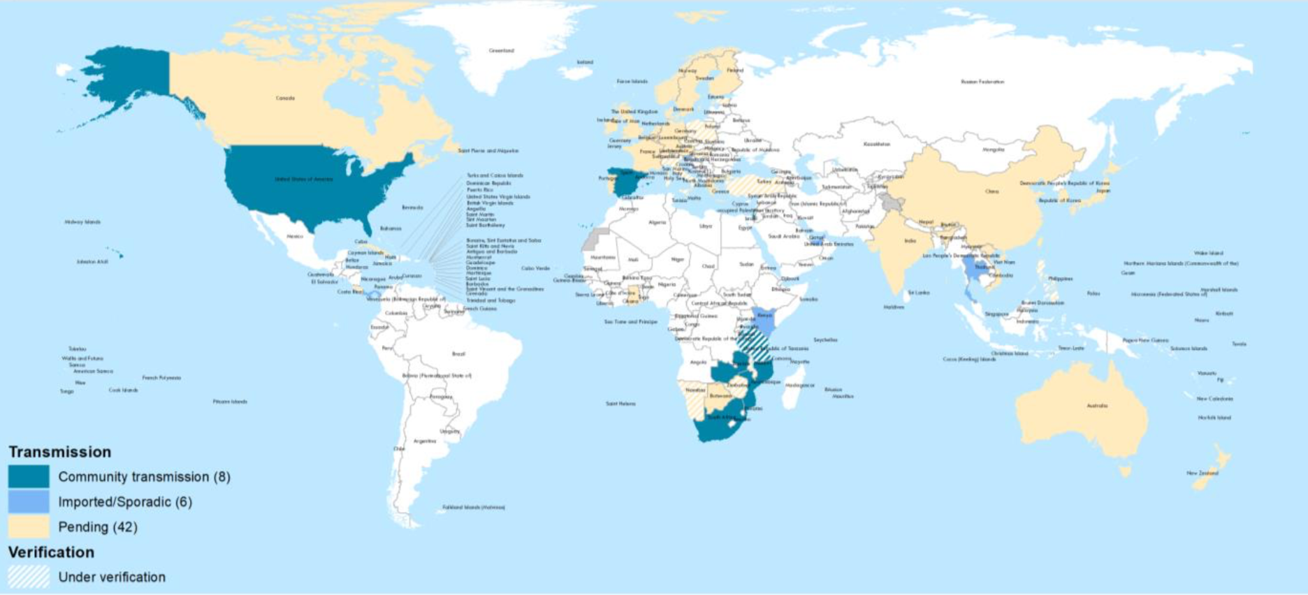 남아프리카 변이는 6개 대륙 전체에 걸쳐 총 56개 국가에서 확인됐으며, 2월 23일 51개국에 비해 5개국이 더 증가했다. 남아프리카 변이의 지역감염은 3개 대륙 8개국에서 보고되었다. 42개국(75%)에 대해 감염 정도의 분류가 아직 명확하지 않다.