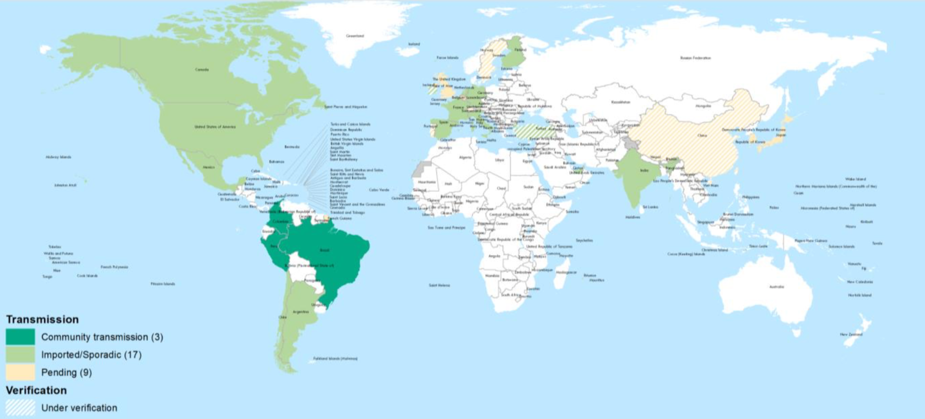 브라질 변이는 6개 대륙 전체에 걸쳐 29개국에서 보고되었으며, 2월 23일에 비해 1개국이 추가됐다. 브라질 변이의 지역사회 감염은 최소 3개 국가에서 보고되었다. 현재 이 변이가 발견된 국가 중 9개(31%) 국가는 감염 정도의 분류가 명확하게 이루어지지 않고 있다.