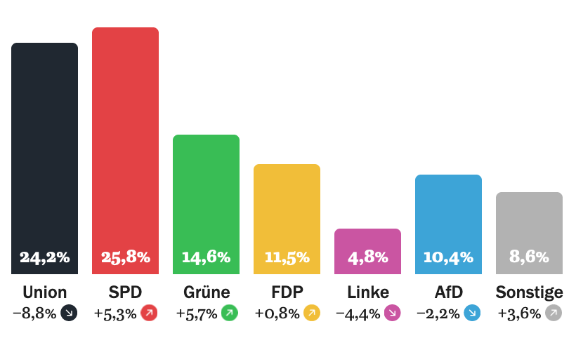 독일 연방의회 선거에서 사회민주당(사민당, SPD) 박빙으로 원내 제1 당이 되었다. 반년 전까지만 하더라도 사민당의 지지율은 15%대에 머물고 있었지만 사민당의 총리 후보 올라프 숄츠(Olaf Scholz)의 인기에 힘입어 이번 총선에서 약 26%의 득표율을 얻었다.