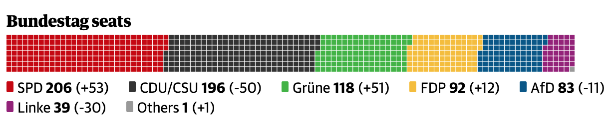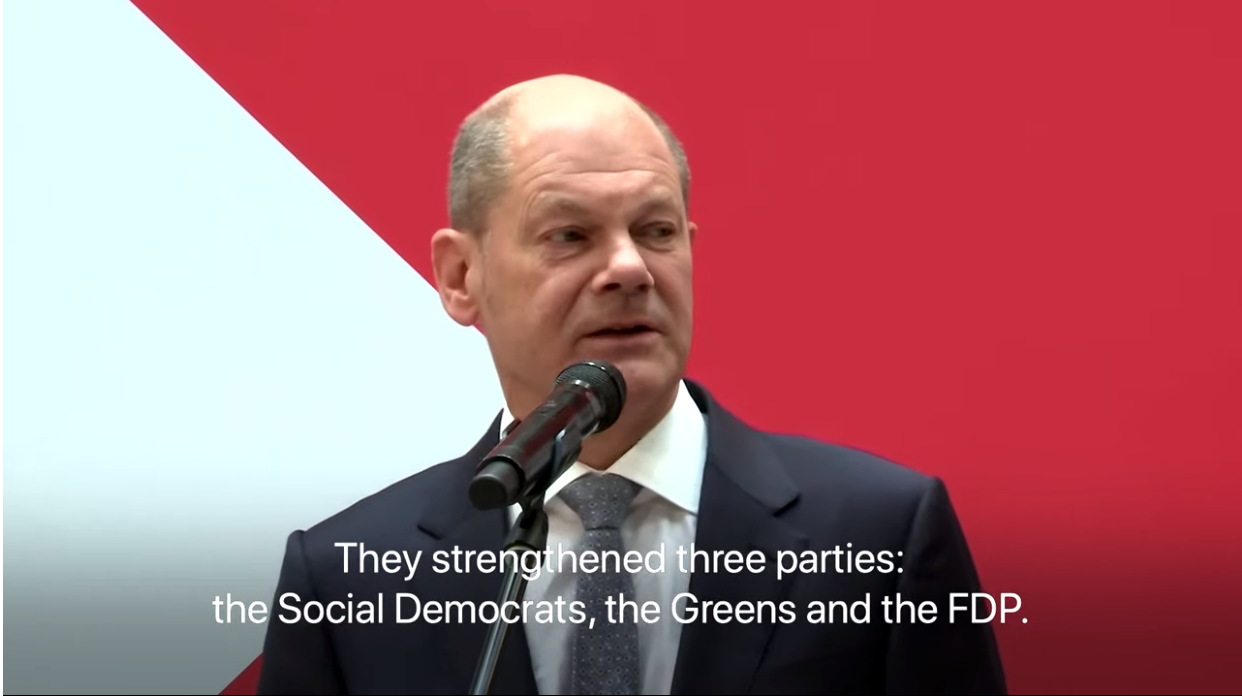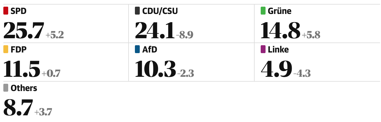 사회민주당(SPD)의 올라프 숄츠(Olaf Scholz)는 월요일 아침 기자 회견에서 "유권자들은 자신을 매우 명확하게 표현했다"라고 말했다. 그의 중도좌파 정당과 녹색당, 친기업 성향의 자유민주당이 이번 선거에서 모두 상당한 표를 얻었지만, 보수 기민련은 거의 9% 포인트의 지지율 감소를 겪었다고 지적했다.